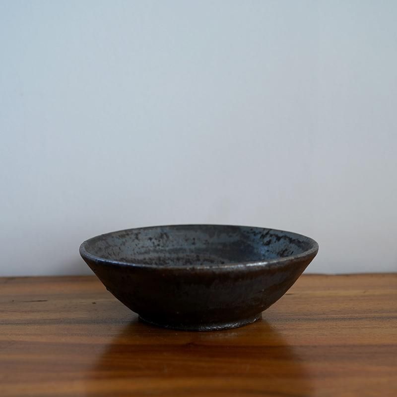 いく層にも重なり奥行きのあるグラデーションが味わい深い黒志野シリーズの平鉢です。これは土を捏ねろくろにて形成したのち、釉薬を塗り焼く作業を3度行います。回ごとに色の違う釉薬を乗せることで深みのある色合いが生まれるのです。またガス釜を使用し無酸素で焼くことで表面がザラつき素朴な風合いを生み出します。今回の焼き上がりはベースの黒から錆びを思わせる赤茶色の上に蒼黒くガラス化した釉薬が非常に美しい仕上がりとなっています。どこか現実離れしたその表情が日常にふとした安らぎを与えて来れます。 少し深さのある平鉢は煮物やサラダ、またカレーなど幅広くご使用いただけます。 幅:20 高さ:6