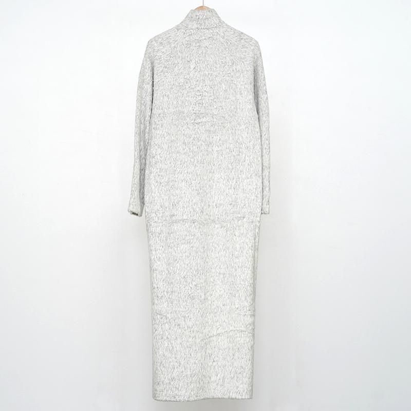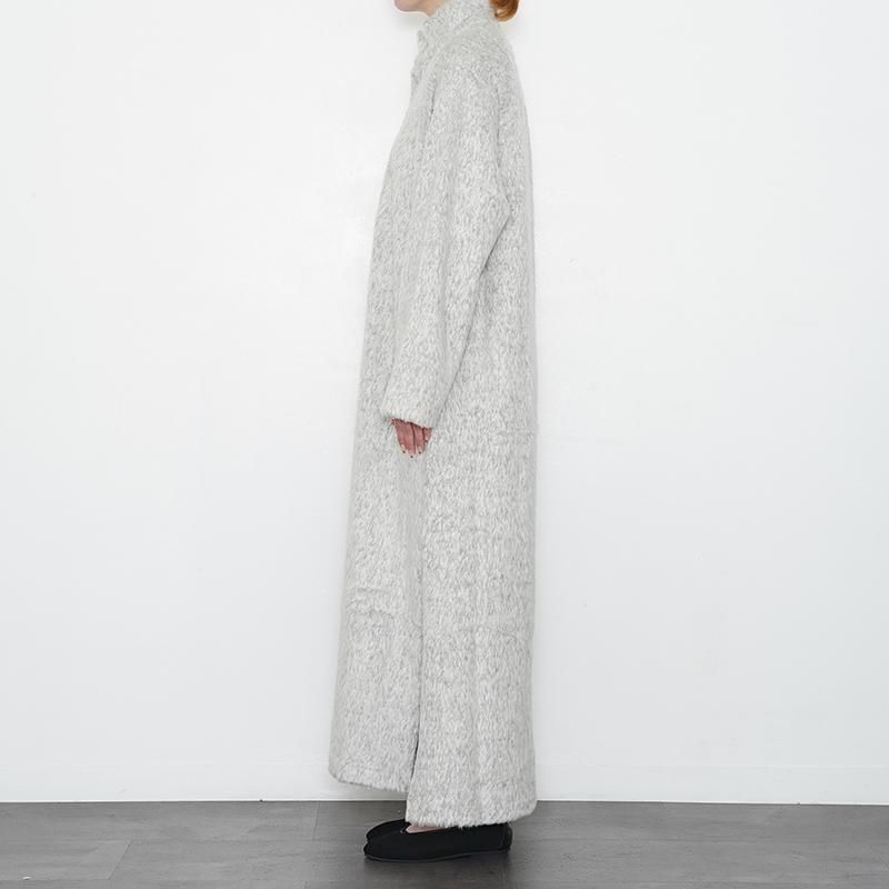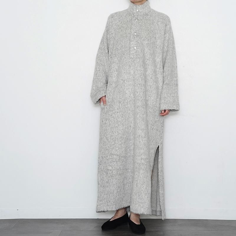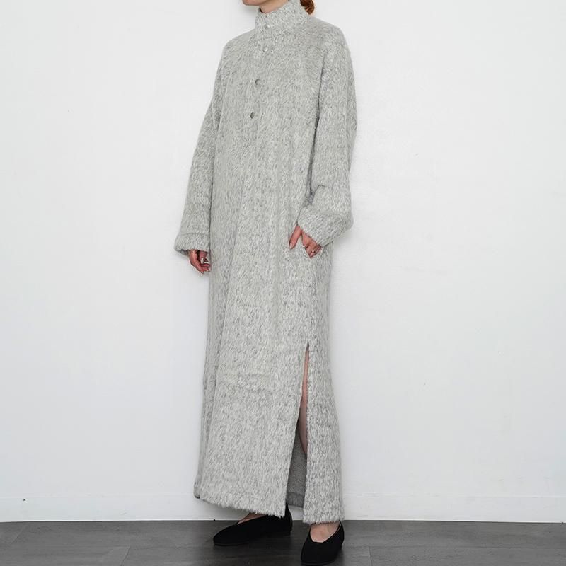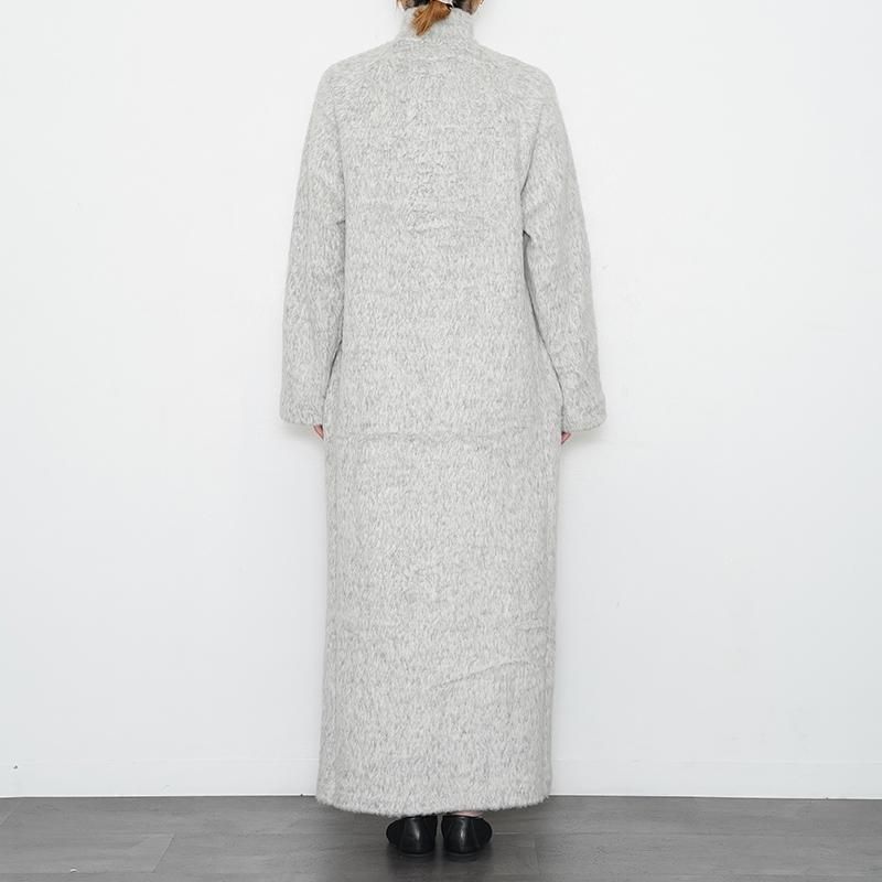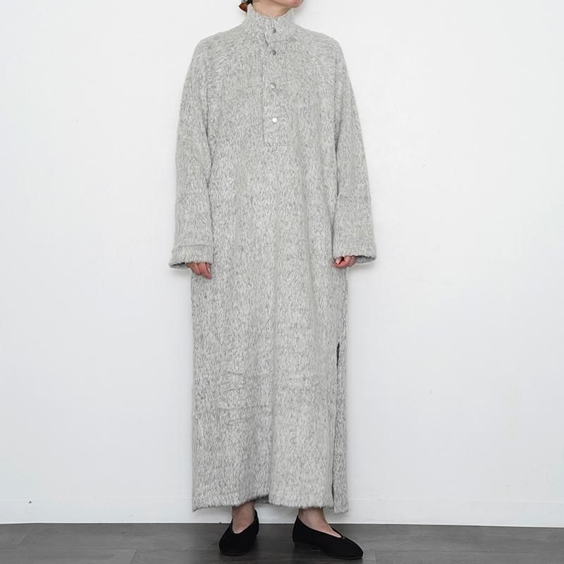 軽くてふわっとした毛並みが特徴的なドレス。 内側はパイルのようになっており肌当たりもとてもソフトです。 フェミニンな印象のシャギー素材も着ると上品なイメージに。 スナップボタンやラグランスリーブといったカジュアルなリラックス感の要素もありながら、裾のスリットのバランスで程よい色気も感じられます。 ボトムとのレイヤードやトレンドのロングブーツなどとシックに合わせるのもおすすめ。 シンプルだからこそ上質さを感じたうえで長く愛用していただけます。 モデル身長155cm 着用サイズ0 SIZE(cm) 0:着丈124 身幅52 裄丈70 QUALITY COTTON67% WOOL30% ALPACA7%