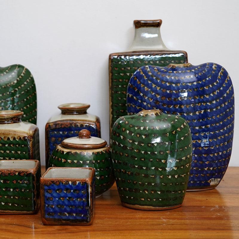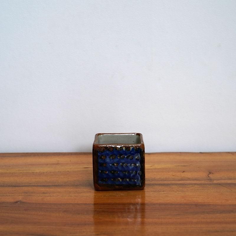 メキシコのメキシコシティに工房を構えるサンヘルマン・セラミカのコンパクトな箱型小物入れです。 サンヘルマンはファミリー経営の工房で、1983年にTonalaにて設立されました。 トナラは元よりメキシコ最大の陶器の町として栄え、そのどこかファニーなモチーフにオリエンタルな絵付けが特徴的で国内外に高い評価を得ています。メキシコの民藝品はほとんどがファミリー経営で、その技術を継承し、また新しい感覚取り入れ発展していきました。 こんな歴史ある地にて始まったサンヘルマン・セラミカですが、設立当初から販売のほとんどをメキシコシティでおこなっており、3年後には工房をメキシコシティ近郊へと移し、発展を遂げます。 現在もファミリーに加え数名の職人と伝統を守りながら常に新しいデザインを模索し、メキシコの民藝の第一線で作品を世界に発信しています。 サンヘルマン特有の三角と丸を細かく組み合わせた模様が斬新であり、手書きで施されるそれは素朴で温かみのある表情を見せています。 Size(cm) 幅:6.5 奥行:6.5 高さ:6