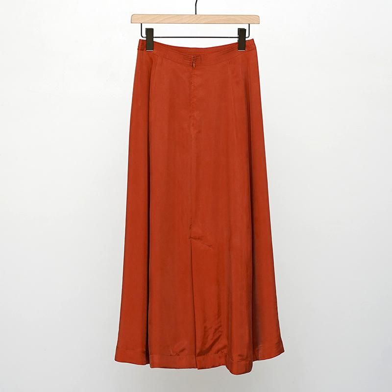 落ち感のあるキュプラをふんだんに使用したロングスカート。光沢感と共に広がるフレアーシルエット。ウエスト周りはラップデザインと両サイドにスリットポケットを配置。足さばきが綺麗に映えるバックスリット。 誕生から90年以上の歴史を持つキュプラ素材。清算の難易度の高さからメーカーの撤退が相次ぎ、今では旭化成社が唯一の日本製製造メーカーとして生産。繊維の表面を起毛させるフィブリル加工を施し、ヴィンテージライクな表情に。柔らかく滑りのよい肌触り。 ※水染みができた際にはクリーニング、もしくはお洗濯のドライクリーニングコースで直すことが可能です モデル身長155cm 着用サイズ0 SIZE(cm) 0:ウエスト68 スカート丈87 1:ウエスト70 スカート丈91 QUALITY CUPRO 100%