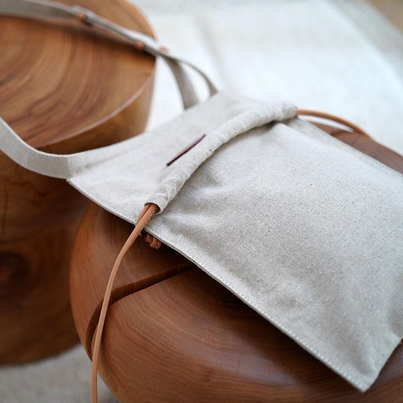 デッドストックのリネン生地を使用した薄型のミニバッグです。しっかりと厚みのあるリネン生地のナチュラルな風合いにレザーのパーツが随所に用いられたデザインがよいアクセントとなっています。 THE BACKWARD VENDERはファッションのトレンドには目を向けることはなく、伝統的な工芸品から、その技術やプロセスを参考に受け継がれた手作りによる美しいデザインに注目しています。 そのデザインコンセプトは仕事や余暇、旅行といった日常生活に根ざしています。天然染色素材のみを使用して一点一点細心の注意を払いながら手作りされ、その芸術性と技術を作品で紹介しています。 彼らはロンドンのハックニーにスタジオを構え、そこは主にショールームとワークショップとして機能しています。 Size H32cm x W21cm strap:40cm