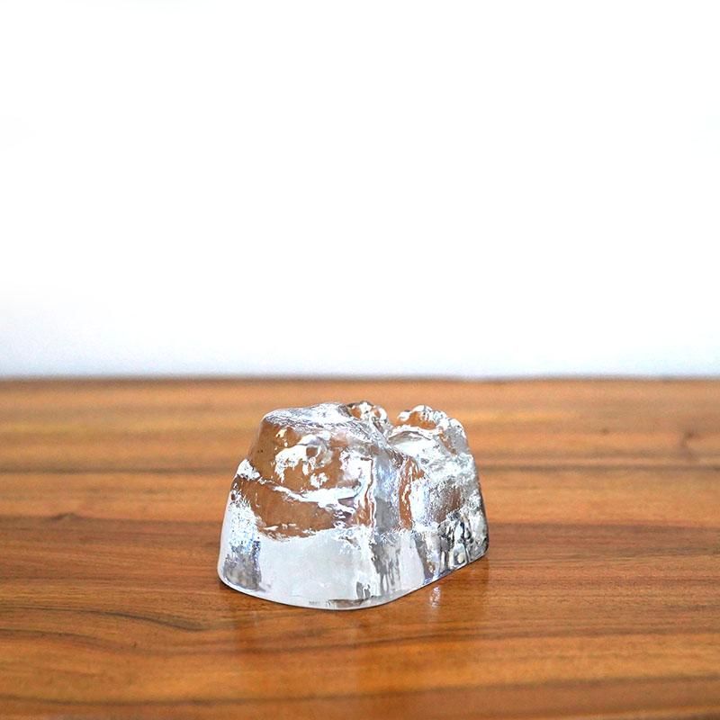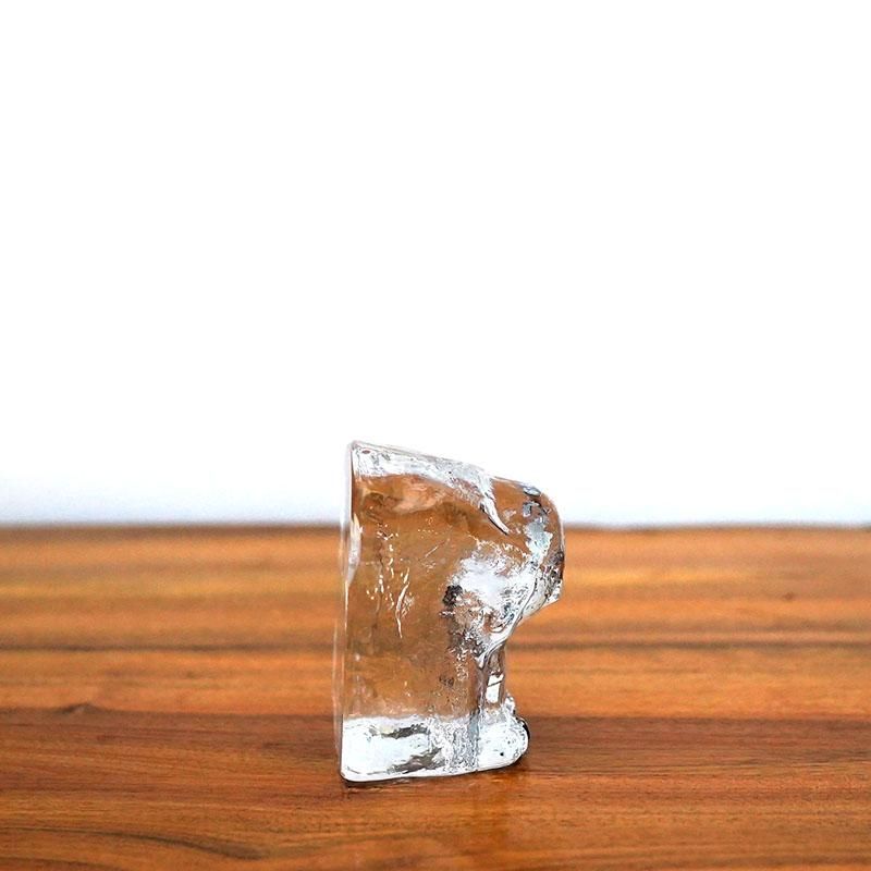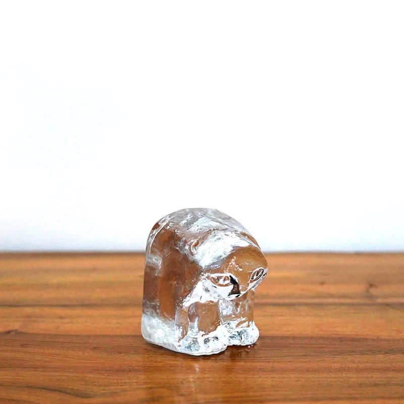 スウェーデンのガラス作家エリック・ホグランによるポーラーベアがモチーフのペーパーウェイトです。 エリック・ホグランはスウェーデン南部、スモーランド地方の町コスタのガラス工房コスタボダ社に1953年〜1973年まで在籍し、デザイン・製造を手掛けていました。 一見自然の氷のような表面の雰囲気が特徴的なクリアーガラスのオブジェ、ペーパーウェイトのシリーズです。動物や人間をモチーフとしており素朴でどこかユーモラスな表情が楽しい作品です。 こちらのポーラーベアも平面的な顔やイラストタッチの目、デフォルメされた前足ととても愛嬌のある佇まいをしています。 コスタボダ社は1742年にガラス工房「コスタ」としてスタートし、1971年にボダ社と合併、コスタボダ社として現在に至り、ヨーロッパの現存ガラス工房では最も古い歴史を持ちます。 サインあり:Boda H1997 ※使用による線傷の見られるところや背面に浅い割れが見られますが、影響は無く良いコンディションです。 Size(cm) 幅:7 奥行き:6 高さ:8