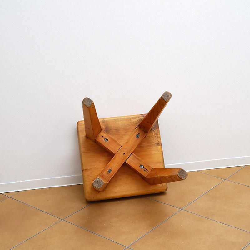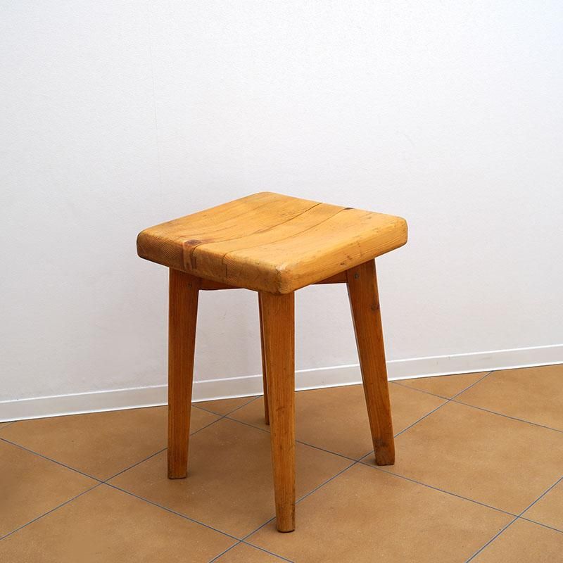 Charlotte PerriandとChristian Duruptによってフランスのメリベルリゾートの為にデザインされたスツールです。 メリベルリゾートは1930年代にスコットランド人のピーター・リンジー少佐によって設立され、第二次大戦後の1940年代後半クリスチャン・デュラプトとポール・ジャック グリロにより本格的な開発がスタートしました。 フレンチアルプスのタレンテーズ渓谷に位置しており、後にペリアンが手掛けるレザルクリゾートは同じサヴォア県内にあり隣接しています。 このメリベルリゾートの開発を皮切りにスキー場を中心にシャレーやホテル、アパートメントが建設、デザインされたコミューンが次々とサヴォア県に計画されていきます。 メリベルリゾートの全体的なデザインをクリスチャン・デュラプトが手掛け、インテリアをシャルロット・ペリアンが担当しました。 後のレザルクの家具類にも使用されるパイン材が用いられ、暖かみがあり素朴な質感が魅力的です。座面の凹みや裏面のクロス状の貫など特徴的なデザインがありシンプルながら43cmと高さも持たせています。存在感がとても高く、制作数も希少な作品です。 ペリアンを筆頭に近年注目されるフレンチ家具は北欧家具とは異なり、傷や擦れ、割れまでもがそのもののストーリーを語る重要なファクターとなっており、ヴィンテージの味として、日本の侘び寂びにも通じる趣があります。もちろん実用的にもラフに使えるところもポイントです。 2019年にはパリのルイ・ヴィトンにて大規模なシャルロット・ペリアン展が開催され、ヨーロッパでも急速に評価を高めています。今後も状態に左右されず長く投機価値の見込めるフレンチ家具は多くの所有価値を見出してくれることでしょう。 日本国内にて汚れ落とし、再塗装、ウレタン仕上げと全体の調整をしています。 貫部分に割れがございますが、接着修理をしております。 ヴィンテージの質感や表情を極力残したまま、パイン材の色合いを蘇らせています。 経年にて生まれた割れや擦れなどは残してありヴィンテージ品の味や雰囲気としてご検討下さい。 Size(cm) 幅:31 高さ:43