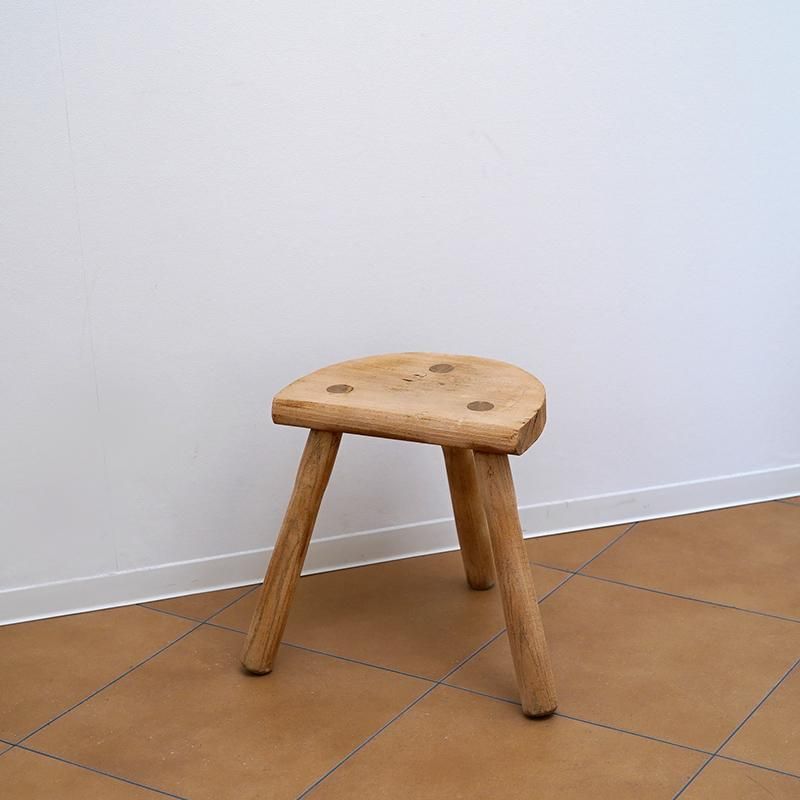 18世紀よりヨーロッパの牧場にて使われてきたスツールデザインで、これはミルクを絞るときに持ち運びに楽な様に考え出された3つ脚と三日月の座面のデザインが特徴的です。 フランスにて60年代に製作、使用されていたミニサイズのスツールです。 少し厚みのある座面と無骨な多面カットに加え無塗装の無垢材の質感がより温かみのある印象を与えています。 スツールとしてももちろん、花台としても雰囲気のある逸品です。 ※経年による擦れや傷等ございますが、使用には問題ございません。 現状ヴィンテージ品である事をこ理解の上、味や雰囲気としてご検討下さい。 Size(cm) 座面幅:27 幅:35 奥行き:29 高さ:29.5
