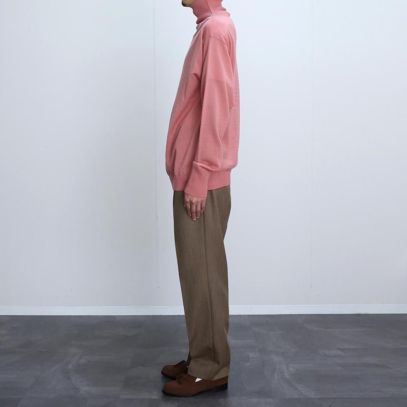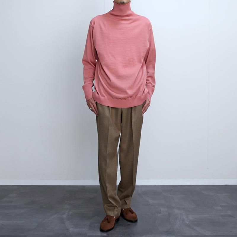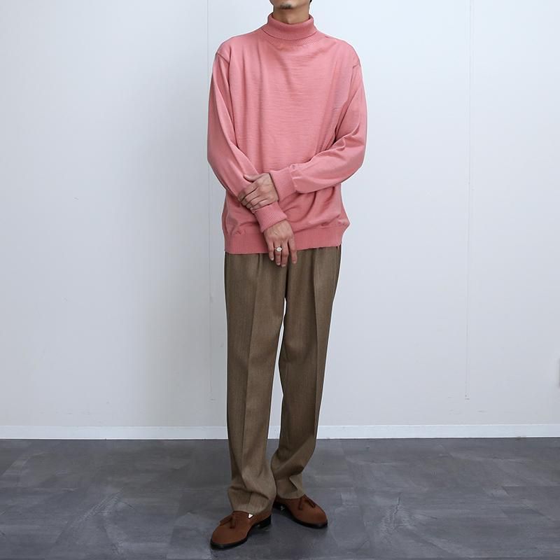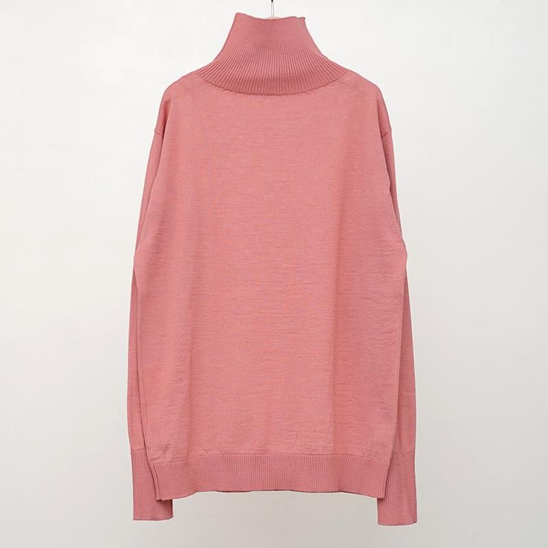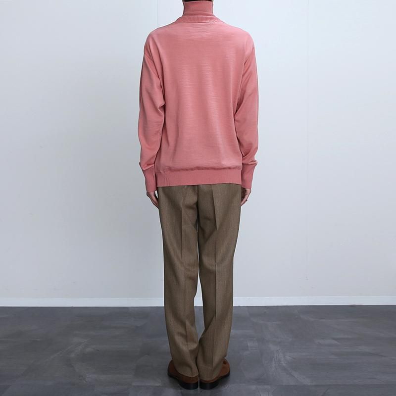 上質なピュアウールを使用し、12ゲージの平編みにて編み立てられたタートルネックセーター。 ボディーは一本取りの糸で度が詰まった編み地。ハイゲージながら、耐久力や毛玉になりにくい機能があり軽量感もあります。 首、袖リブは番手の低い糸を使用したリブ編みで、より強くしっかり引き締まった見え方を演出。やや高めのネックはスマートな雰囲気もあり、折り返しての着用でも◎ ハイゲージの大人っぽい印象と上質な見え方で1枚でサラッと着用するだけでも良し、インナーとしても薄手でもたつきがない優秀なバランスです。 当時の船員が前後気にすることなく気軽に着用できる伝統的なニットを再現しているため、こちらもそういった仕様です。 クラシカルな製法を用いられたプロダクト。 世界最高水準の技術を感じられる素晴らしい一着です。 モデル身長184cm 体重64kg 着用サイズXL SIZE(cm) M:着丈70 肩幅44 身幅53 袖丈64 L:着丈71 肩幅48 身幅56 袖丈66 XL:着丈74 肩幅52 身幅59 袖丈67 QUALITY PURE NEW WOOL100% m20231233