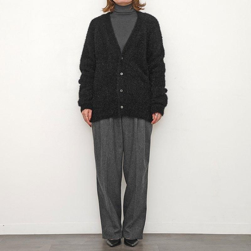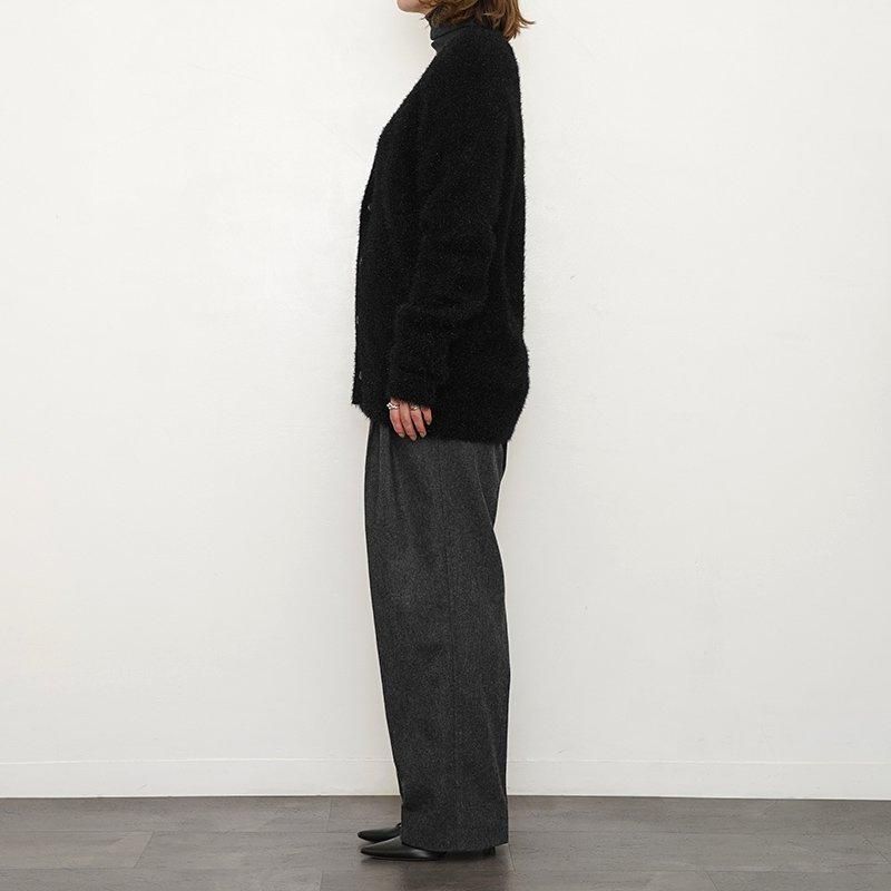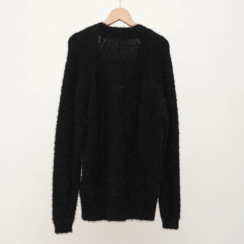 イタリア PRATO近郊で作られたシャギー糸でスパークナイロンを含んだシャギー部分の光沢が特徴です。ゆったりとしたシルエットのヒップが隠れる丈のカーディガンです。 モデル身長155cm 着用サイズ1 SIZE(cm) 1:着丈70 身幅50 裄丈79 QUALITY NYLON100% l202411242