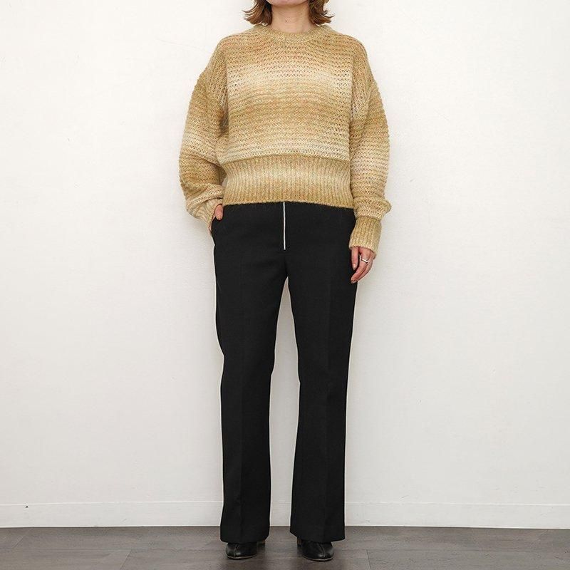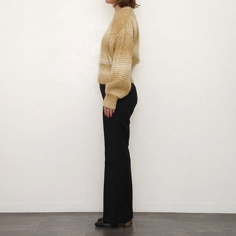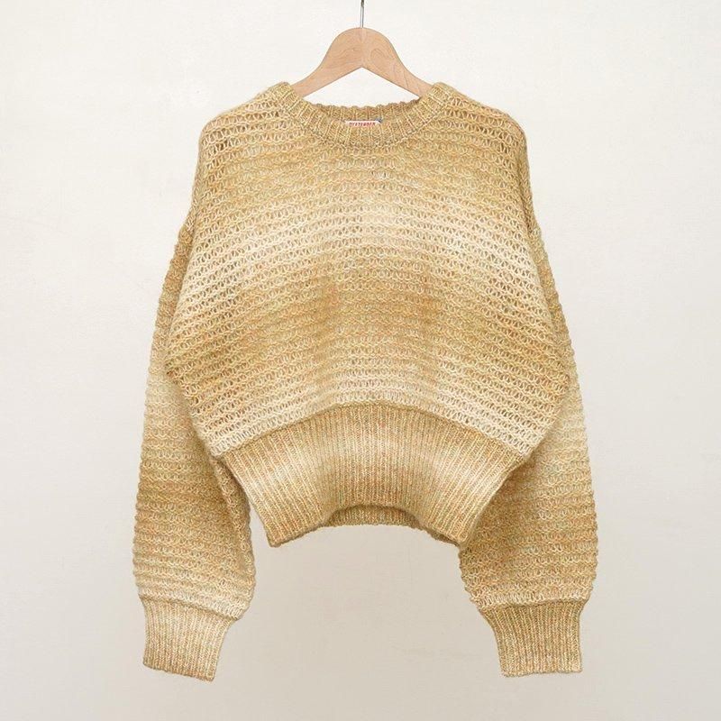 風船のような袖と身頃の短丈シースルートップス グラデーション系を使用しているので、ボーダーとは一味違う色気の漂う一枚になっております。クロップド丈ですが、ウエスト周りをダブルリブで覆うので、落ち着く着心地です。 モデル身長155cm 着用サイズ0 SIZE(cm) 0:着丈49 肩幅57 身幅60 袖丈50 QUALITY WOOL58% MOHAIR24% NYLON18%