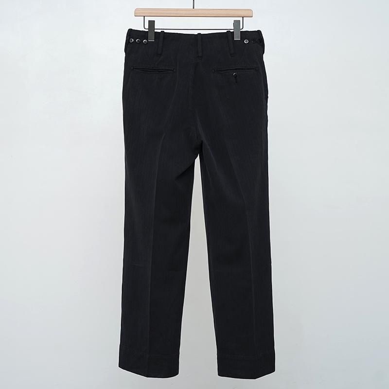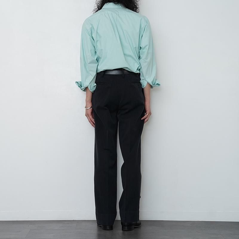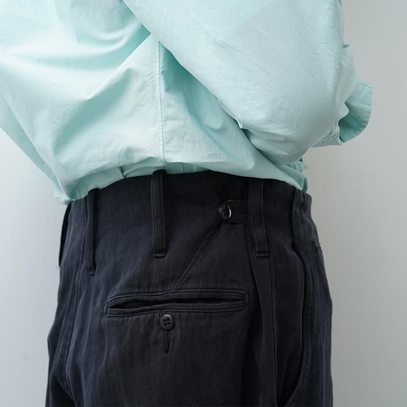 "夏に履ける黒"をテーマとして制作されたチノトラウザー。 素材は経糸に原料の良いGIZAコットン、緯糸にはリネンシルクの混紡糸を採用することで、夏場でも着用しやすい履き心地に仕上がっています。 形は昨年より少し緩やかになり、より夏場でも着用しやすいシルエットへ変更。 肌触りが冷ややかなこちらのトラウザーはこれからの時期に間違い無く活躍する1本。 新色のKAKHIには、緯糸にヘンプも追加されています。 ブランドのファンにはもちろん、綺麗なスラックスが増えてきている方にもぜひ試して欲しい1着です。 サイズ比較↓ モデル身長175cm 体重56kg 着用サイズ2 SIZE(cm) 1:ウエスト80 股上33 股下76 ワタリ33 裾幅24.5 2:ウエスト82 股上34 股下76 ワタリ34 裾幅25 3:ウエスト84 股上34.5 股下76.5 ワタリ34.5 裾幅25.5 QUALITY BLACK:COTTON75% LINEN18% SILK7% KHAKI:COTTON78% HEMP12% LINEN7% SILK3%