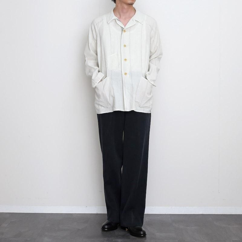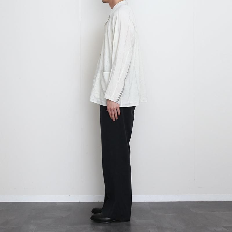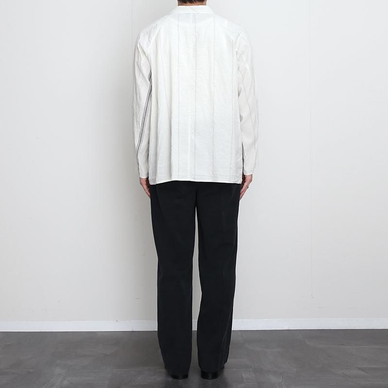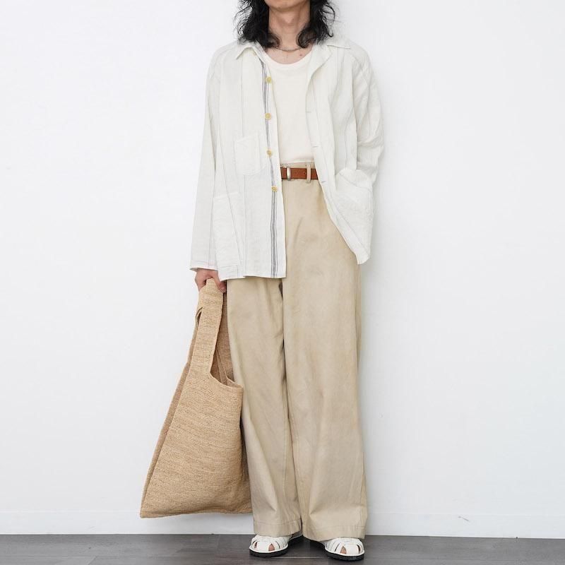 昨シーズンの継続素材コットンリネンのランダムストライプを用いたカバーオール。 夏でもしっかり羽織れるようライトに製作するため、特殊な縫製仕様かつ、職人の技が随所に光る手間暇かかった1着。 かなり軽く、ざっくりしたサイジングでシャツ感覚で着用いただけるアイテム。 強撚したコットンとリネンの平織りで、ハリコシがありながらもドライで軽量感のある独特な表情が魅力の生地。 ストライプのピッチや配色がランダムに設定され、製品洗いによって生まれるシワ感が雰囲気を更に増しラフさも演出。 Tシャツの上から適当にバサっと羽織って、ざっくり袖を捲ってあげるスタイルなんかがオススメです。 【スタッフコメント】 真夏でもタンクトップの上から着られるアウターを求めて、個人オーダー。 汗っかきなので洗濯が可能なのも嬉しいポイントです。 ザラっと良い着心地なので、ベタベタしなくて、真夏でも本当に快適ですよ。 海や川、フェスに着て行くのも素敵だな〜とワクワクしてます。 他に個人オーダーしてたマーティーのグレーのトラウザーズ“JEFFELY”やショーツと合わせるのが楽しみです。 モデル身長177cm 体重63kg 着用サイズ2 SIZE(cm) 1:着丈72.5 身幅61 裄丈73 2:着丈74 身幅61.5 裄丈74 3:着丈75 身幅64 裄丈77 QUALITY COTTON51% LINEN49% m20254302 m2025652