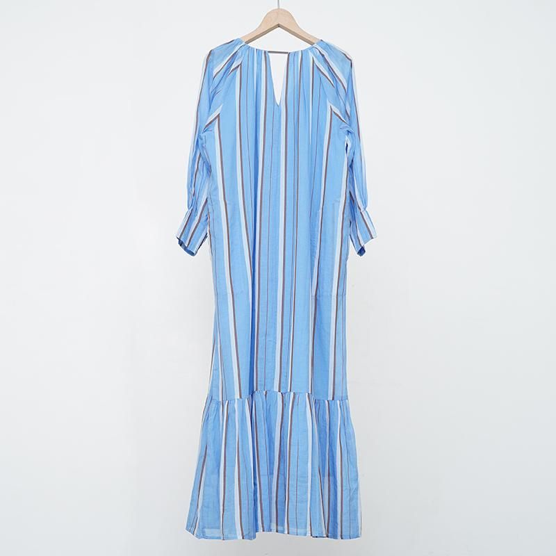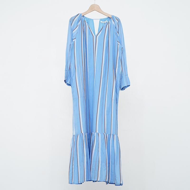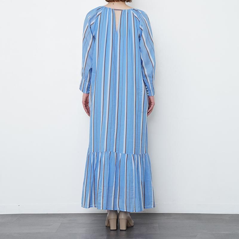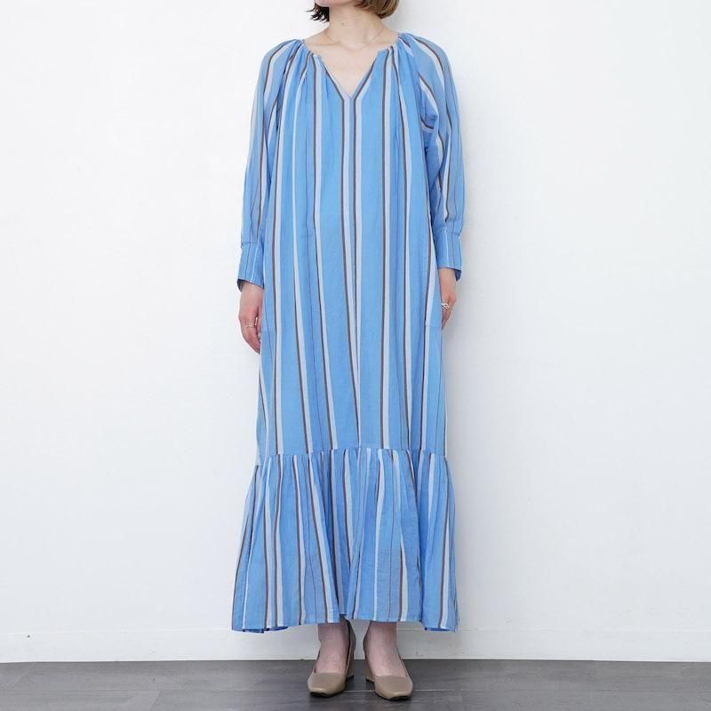 コットンボイルの心地よさをふんだんに感じられる、テキスタイルに包まれるようなドレス。 ギャザーネックドレスは、胸元のあきと、背のVあきのデザインが女性らしい一枚。 裾周りに広がるギャザー、丁寧にピンタックで留めた袖口も、穏やかにフェミニンなムードを盛り上げています。 身頃にはコットンボイルの裏地を重ね、袖は一枚仕立てに。 袖にやわらかく沿う袖から、透け感のあるストライプ織の美しさと心地よさが感じられるはずです。 モデル身長155cm 着用サイズS SIZE(cm) S:総丈123 身幅53 裄丈57 M:総丈134 身幅53 裄丈57 QUALITY COTTON100%