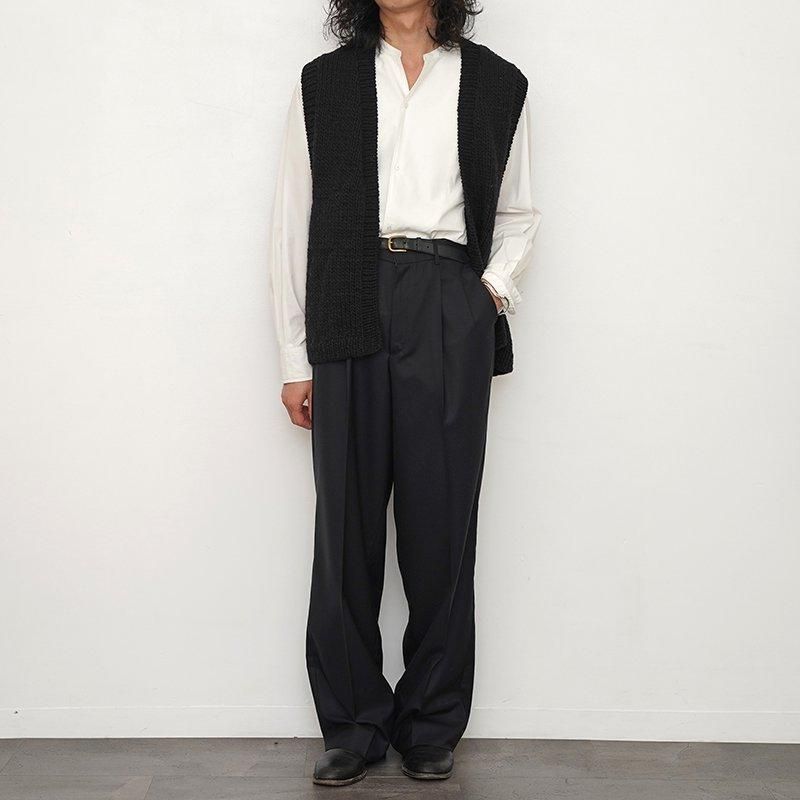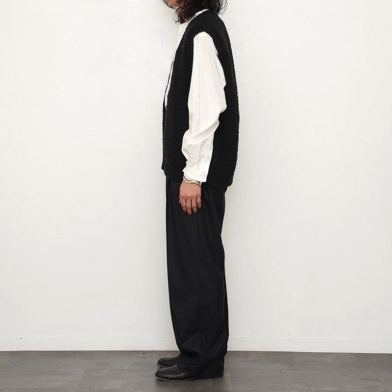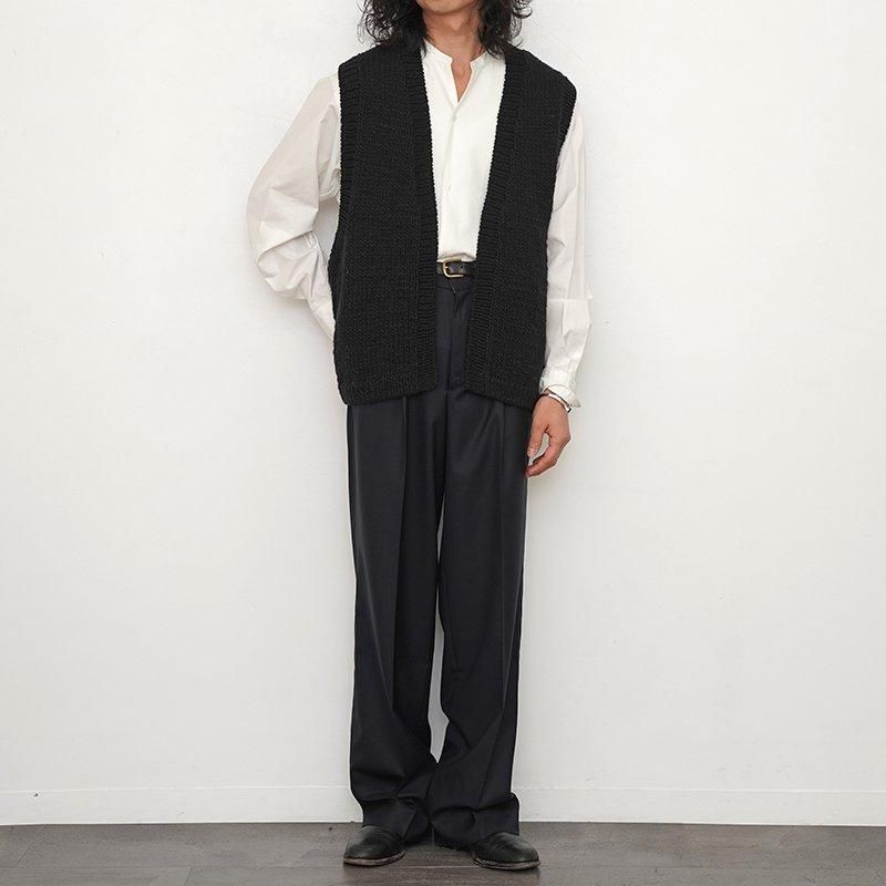 熟練の職人によるハンドニットのVネックベスト。 洗練されたボタンレスのミニマルさは、レイヤードに奥行きも演出。 肌寒い時期はシャツやスウェット等の上からアウターとして合わせ易く、汎用性も兼ね備えます。 真冬のアウターの中に着たり、室内でのアウターとしても重宝します。 南米ペルーにて、1着ずつ丁寧に手編みされたことで機械編みでは再現不可能な表情がポイント。 ハンドニットながら抑えめな価格設定も見逃せません。 全て手作業のため多くは生産出来ない点も、大量生産の現代だからこそ魅力的です。 旧式の機械で丁寧に紡績された独特の風合いと、軽さとボリュームがこの素材の特徴。 ご家庭での手洗いが可能なのも嬉しい点です。 現地のハイランドウール糸の太番手は、滑らかで柔らかいため、素肌に触れてもストレスフリー。 サイズ感はユニセックスで着られるワンサイズ展開で、シルエットはややゆったりしつつ、現代的なフォルムになっています。 ※手編みニットのため、採寸に若干の個体差があります。 予めご了承ください。 モデル身長175cm 体重56kg 着用サイズF SIZE(cm) F:着丈64 肩幅47 身幅60 QUALITY WOOL 100%