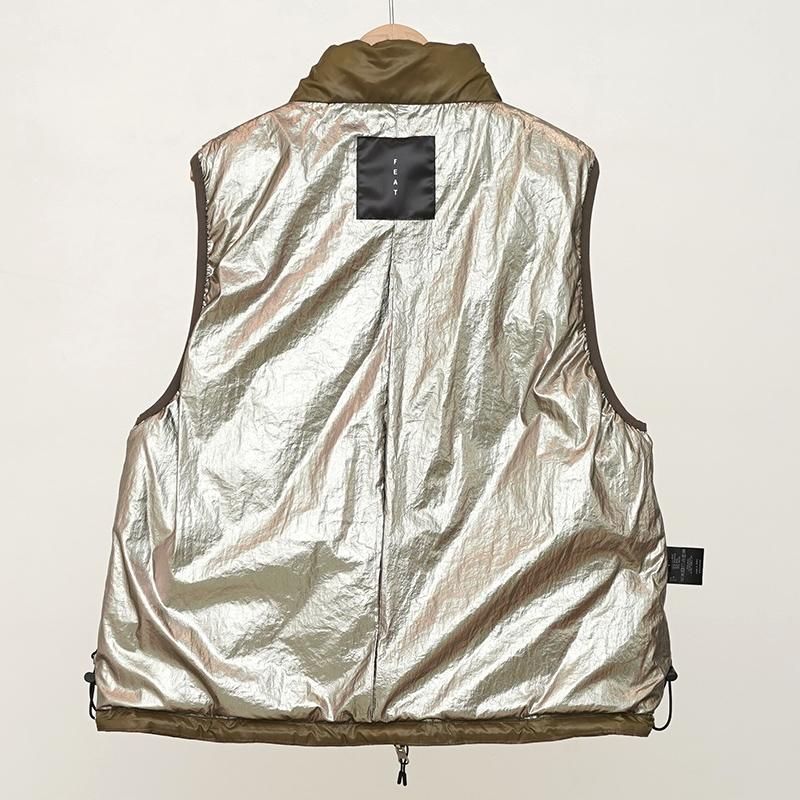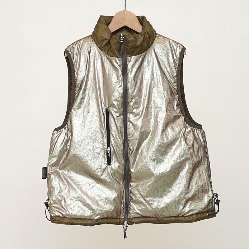 ブランド新型モデルとなるキルティングダウンベスト"ROES"。 キルティングの縫い目に沿って、コンシールジッパーを用いたポケットがフロントの胸部、裾元のサイドに4箇所採用。 またそれ以外にも前面のパイピング部の隙間から収納可能のフロントポケット付きと、機能とデザインが融合された洗練された作り。 アームホールにもパイピングが施され随所にアクセントも持たせています。 裾はドローコードで絞り調整が可能、ジップはダブルジップ採用とシルエットの変更もお楽しみいただけます。 裏面はメタリックなシルバーカラーで目を引く他、リバーシブル仕様ではないですが裏面での着用でも良さそうです。 程よいボリューム感ですので、スウェットやニットの上からアウターとしてはもちろん、インナーダウンとしての機能も◎ SIZE(cm) 1:着丈60 肩幅40 身幅52 2:着丈64 肩幅41 身幅53 QUALITY SHELL: POLYESTER100% LINING: POLYAMIDE100% FILL: DOWN80% FEATHER20%