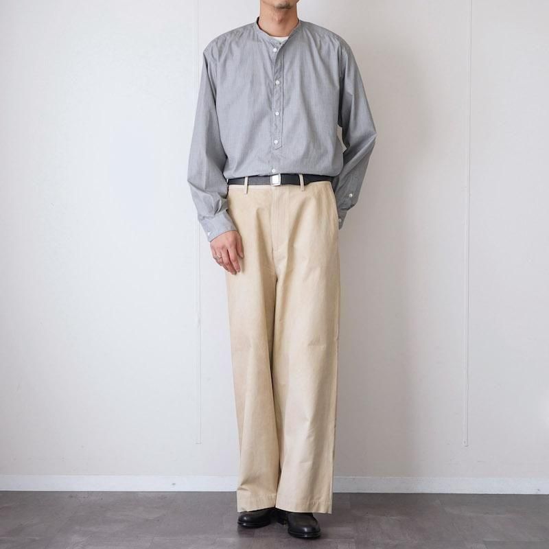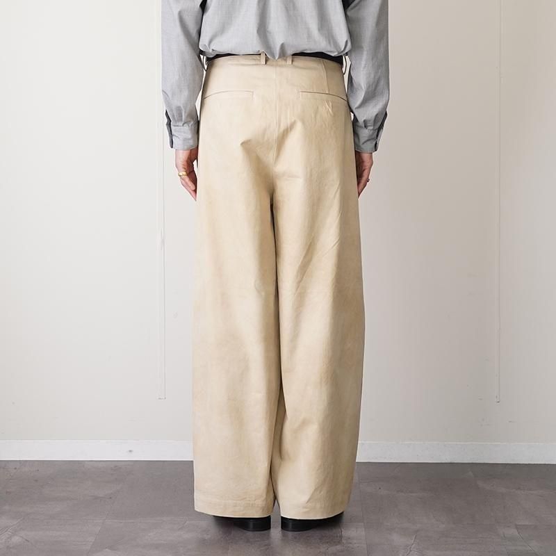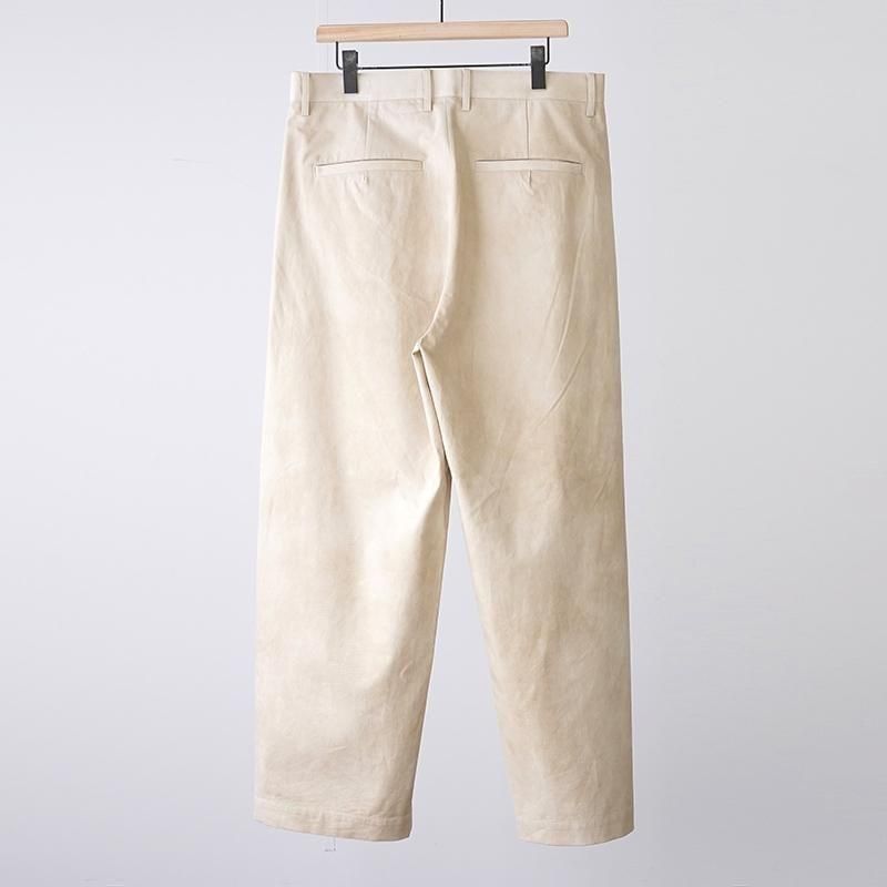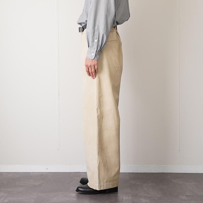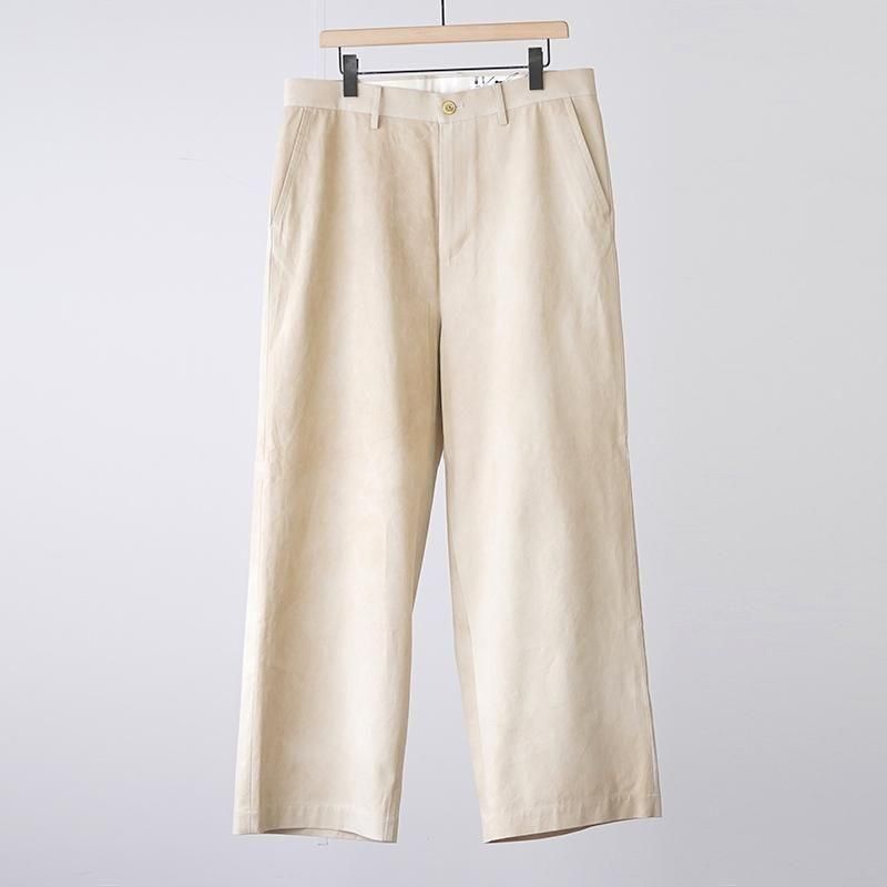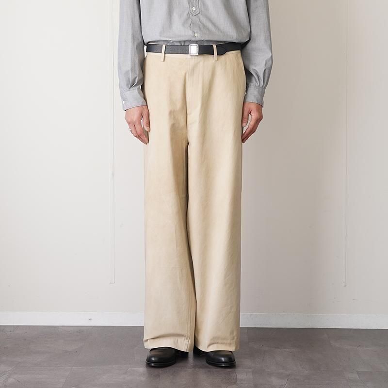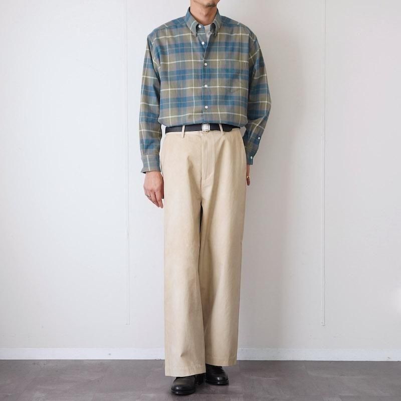 素材にはコットン100%を使用し、表面はわずかにツルッとした滑らかな仕上がり。通常のチノパンにありがちな野暮ったさを抑えつつ、ムラ染めによるベージュの色調がほんのり奥行きと表情を加えています。 シルエットはワークパンツ由来の太幅設計を踏襲し、腰まわりにゆとりを持たせながら、裾にかけて自然に落ちるライン。履くだけで迫力のあるスタイルに仕上がります。 素材と構築のバランスを追求したデザインで、上質なモダンワークパンツとしても、ラフに穿き込むカジュアルユースとしても成立します。 ストリートの自由さと仕立ての精緻さを同居させた、I am dorkらしい一本です。 サイズ比較↓ モデル身長184cm 体重64kg 着用サイズ2 SIZE(cm) 1:ウエスト85 股上38 股下72 ワタリ36 裾幅28 2:ウエスト90 股上38 股下73 ワタリ37 裾幅29 QUALITY COTTON100%