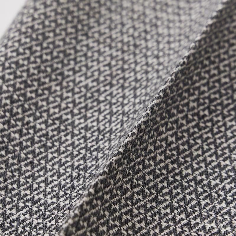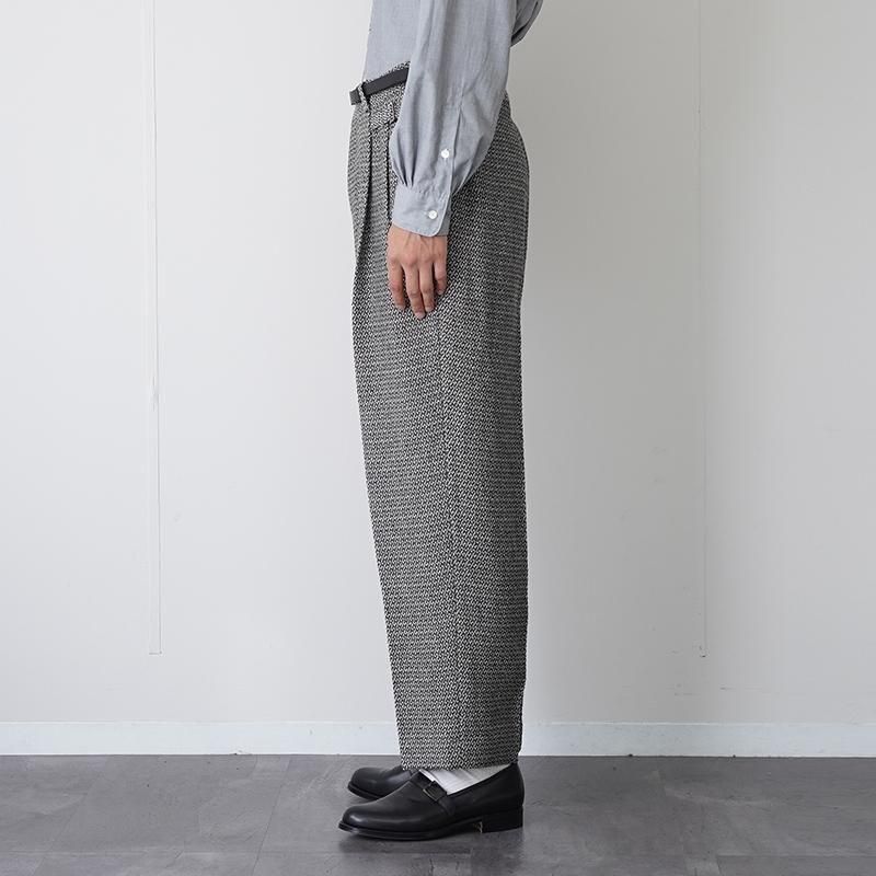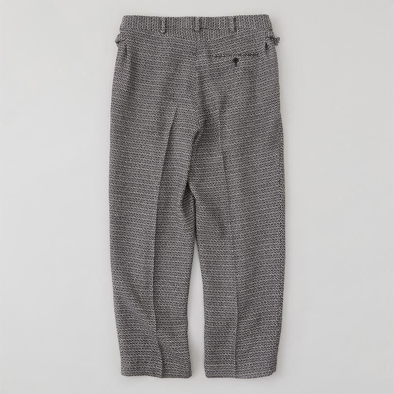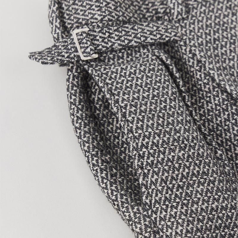 “N”が刻まれた、物語のある素材。 コットンとリネンの杢糸に、メリノ混のシェットランド糸を重ね、ドビー織機で“N”を描いたオリジナルツイード。 軽い縮絨仕上げを施すことで、古着のような柔らかさと表情が生まれています。 デザインの軸は、フランスとイタリアのクラシックパターンを踏襲したハイウエスト仕様。 腰元のストラップでフィットを調整するスタイルは、ベルトレスで穿く美学を想起させます。 オールド感漂う素材感とクラシカルなハイウエスト設定のトラウザーが90年代のムードを演出しています。 モデル身長184cm 体重64kg 着用サイズM SIZE(cm) S:ウエスト81 股上30 股下71 ワタリ35 裾幅20 QUALITY SHELL : 48% WOOL, 29% COTTON, 23% LINEN LINING : 100% ACETATE