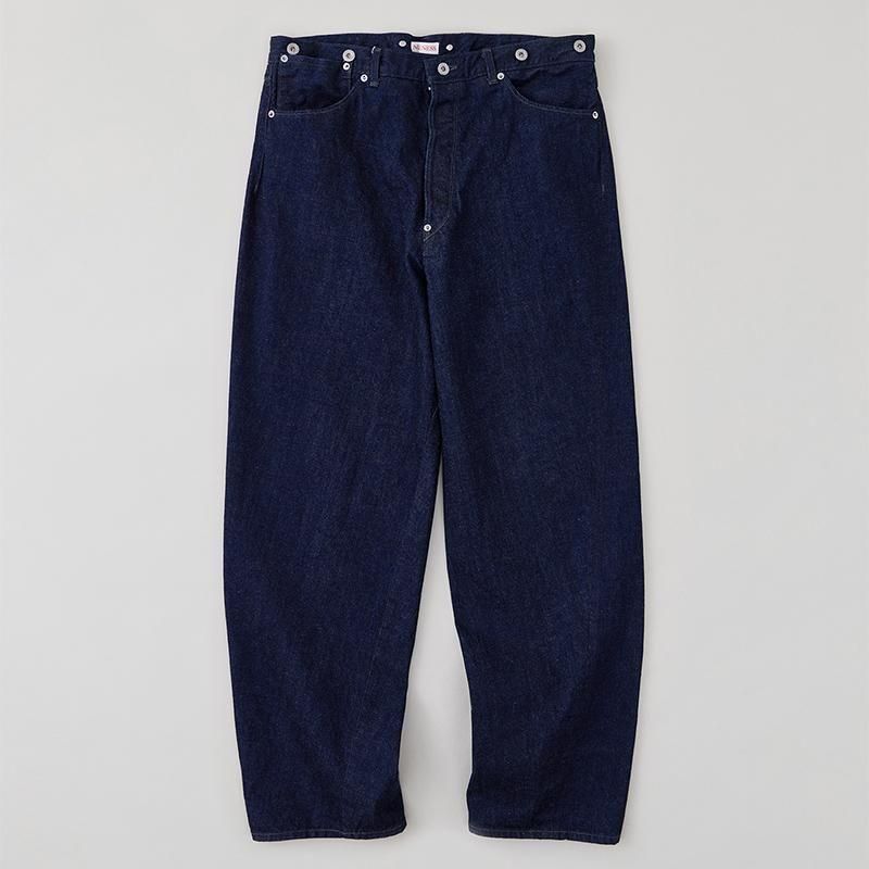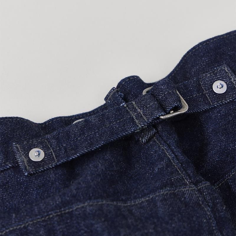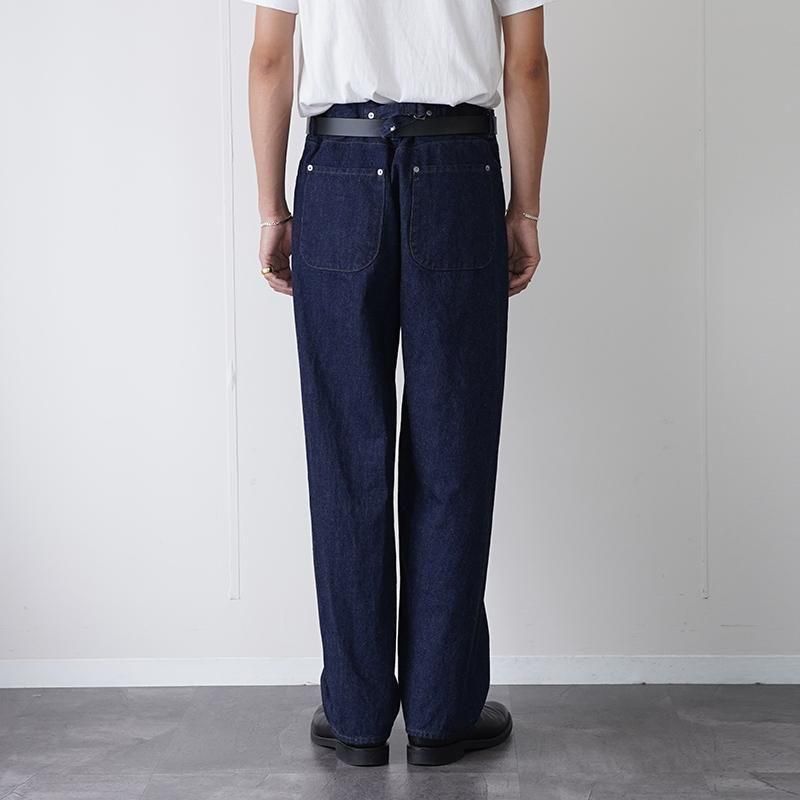 アメリカンワークを現代的に再構築。 1960年代のデニム素材を研究しリプロダクトした14デニム生地を使用しているカーペ ンターパンツ。 ヴィンテージジーンズの特徴でもある捻れからインスピレーションを 受け、左右のパターン構成を調整しアメリカンワークにはないシルエットを構築した デザイン。 ヴィンテージ感を表現するため仕上げ後の毛焼き・ねじれを修正するスキュー加工無しで作り上げています。 モデル身長184cm 体重64kg 着用サイズL SIZE(cm) S:ウエスト82股上31.5 股下73 ワタリ31 裾幅20.5 M:ウエスト86 股上32 股下75 ワタリ32 裾幅21 L:ウエスト90 股上33 股下77 ワタリ34 裾幅22.5 QUALITY COTTON100% LEATHER PATCH : DEER LEATHER