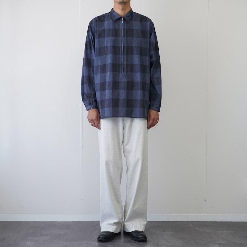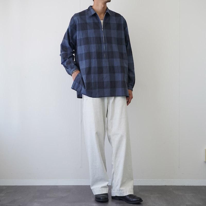 もう織られることのない、美しい時間を纏う。 すでに閉鎖されたイタリアの名門シャツ地メーカーが遺した、多彩なデッドストック生地。 製糸からフィニッシングまでを一貫して自社で行っていた、今では稀有な存在でした。 その丁寧な手仕事の痕跡が残る生地を選び抜き、現代の感性で一着のシャツへと昇華。 デザインは1940年代のドレスシャツの構成をベースに、 一枚でさらりと着られるカジュアルなプルオーバースタイルへ再設計。 ロングジップのアクセントが、過去と今とを静かにつなぎます。 手の込んだ織り、複雑で美しい色構成、そして時代を越えた希少性。 今この瞬間にしか出会えない、一期一会の一着です。 モデル身長184cm 体重64kg 着用サイズM SIZE(cm) S:着丈75 肩幅49 身幅65 袖丈61 QUALITY COTTON100%