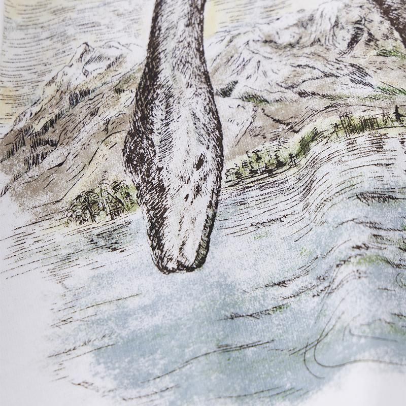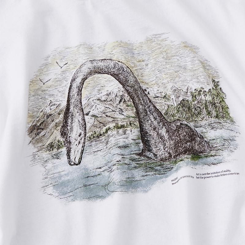 UMA(未確認動物)をプリントした6.0ozのヘビーウェイト半袖Tシャツ。1980〜1990年代のアメリカ製の動物プリントTシャツを目指して制作しました。色ごとにプリント の版を分け、重色などを繰り返すことでヴィンテージプリントに見られる奥行きを表 現。目の詰まったタフな生地感と、US Cottonを使用したざっくりとした素材感から もアメリカを感じられます。UMAは子供の頃によくテレビ番組で探していたネッシー、 ビックフッド、ツチノコです。