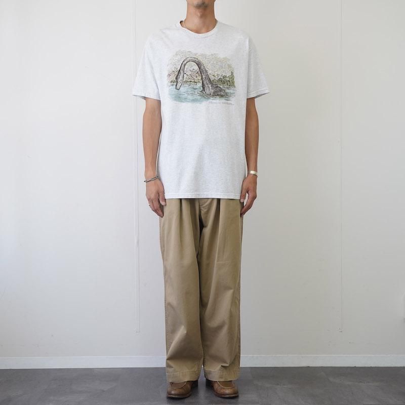 UMA(未確認動物)をプリントした6.0ozのヘビーウェイト半袖Tシャツ。1980〜1990年代のアメリカ製の動物プリントTシャツを目指して制作しました。色ごとにプリント の版を分け、重色などを繰り返すことでヴィンテージプリントに見られる奥行きを表 現。目の詰まったタフな生地感と、US Cottonを使用したざっくりとした素材感から もアメリカを感じられます。UMAは子供の頃によくテレビ番組で探していたネッシー、 ビックフッド、ツチノコです。