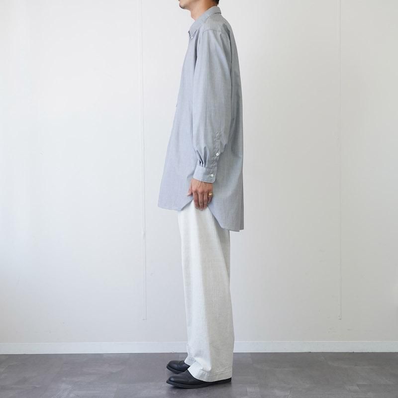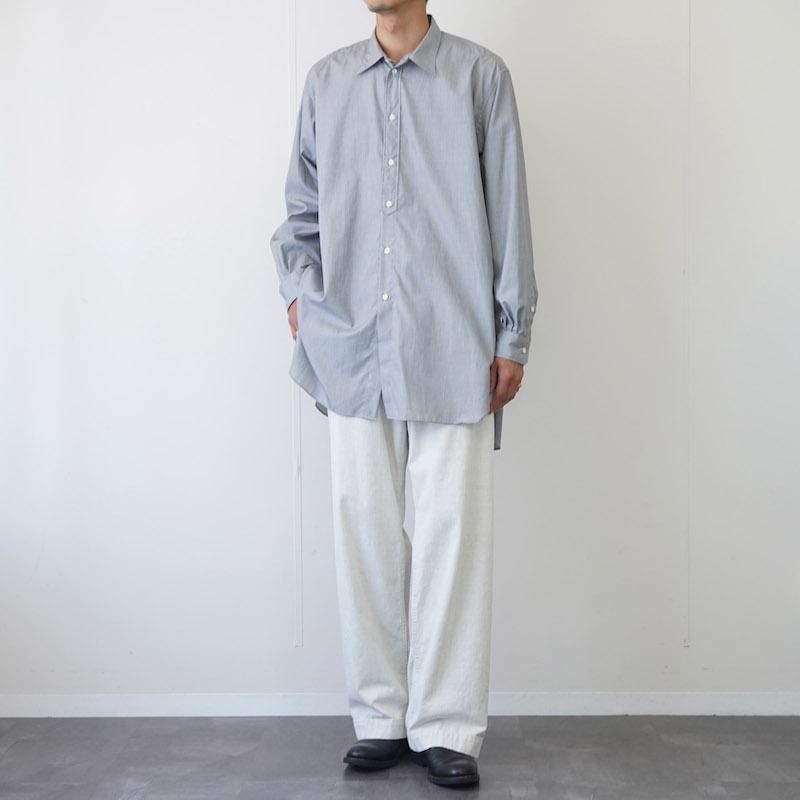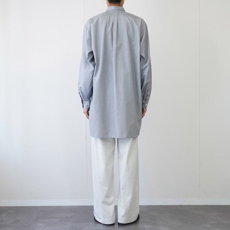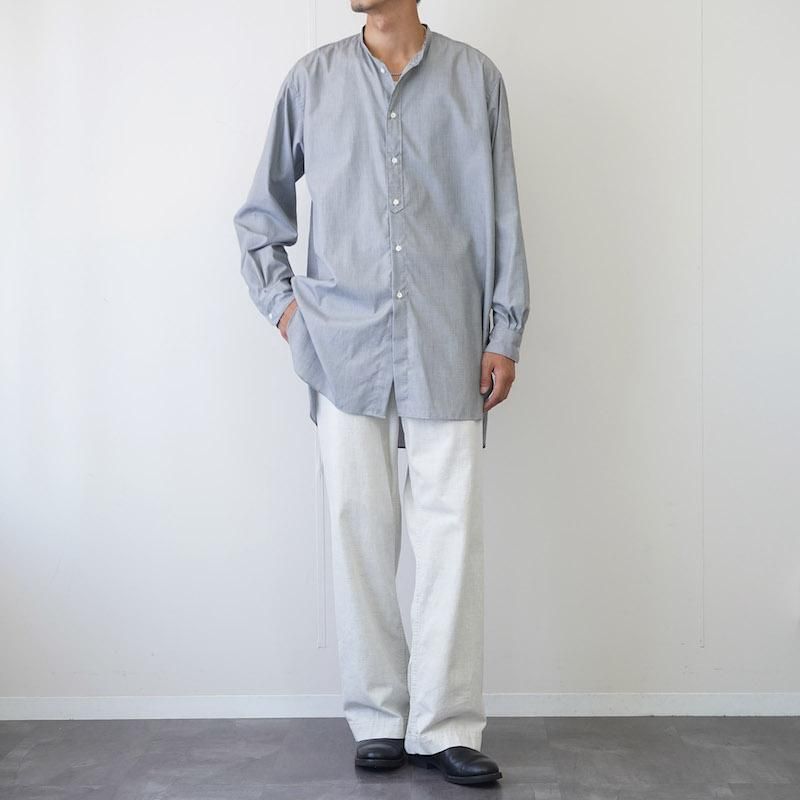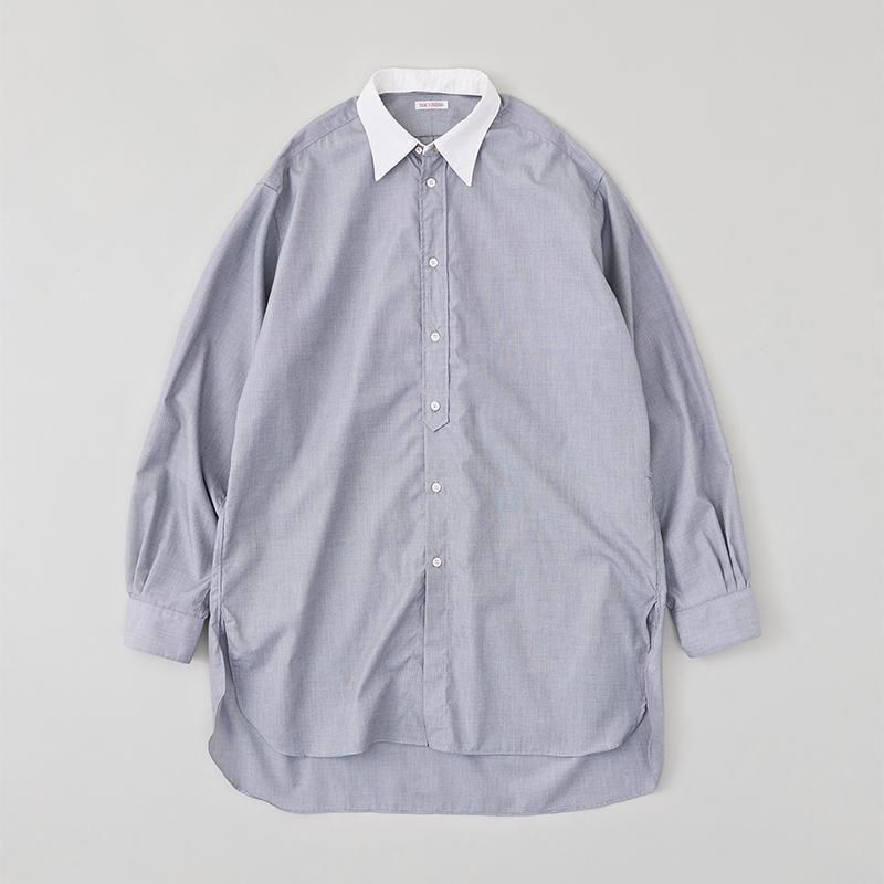 静けさの中に、精巧さが宿るロングシャツ。 1920年代アメリカのドレスシャツや、英国ミリタリーシャツのカッティング・ディテールを再構築し、 モダンなフォルムで仕立てたデタッチャブルカラーのロングシャツ。 素材には、スーピマコットンのコンパクト糸を限界まで高密度に織り上げた ハイカウントのハケメシャンブレーを使用。 その密度ゆえに生まれるしなやかな張りと、繊細な織り目の美しさは圧巻です。 さらに、生地の最終仕上げには特別な“バイコ加工”を施し、 肌に触れた瞬間にわかる、パウダータッチのなめらかさと、静かに光を纏うような風合いに。 クラシカルな佇まいに、現代の品格と感性を重ねた、特別な一着です。 【スタッフコメント】 2色の襟が付属してて一石三鳥なシャツ。確か2年ぶり?のリリースです。 当時、即完売していて買えなかった苦い思い出があります。 久々のリリースの今回、個人オーダーでリベンジを果たしました。笑 3wayのどの表情も違うので、ちゃんと使い分けしていける楽しさを感じてます。 特にクレリックカラーで着るのが好みで、丁度いまの気分的に探してました。 ただ、クレリックカラーって主張が強いからこそ、10回くらい着たら飽きが来ちゃいそうな気もしてて。 取り外しで味変できるのは、やはり最大の強みだと思ってます。 デニムパンツでもスラックスでもバランスが良いのも嬉しいです。 モデル身長184cm 体重64kg 着用サイズL SIZE(cm) S:着丈前84 着丈後93 肩幅48.5 身幅62 袖丈61 M:着丈前87 着丈後95 肩幅51 身幅64 袖丈63 L:着丈前89 着丈後97 肩幅52 身幅65 袖丈64 QUALITY COTTON100%