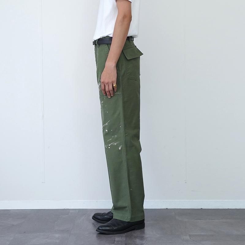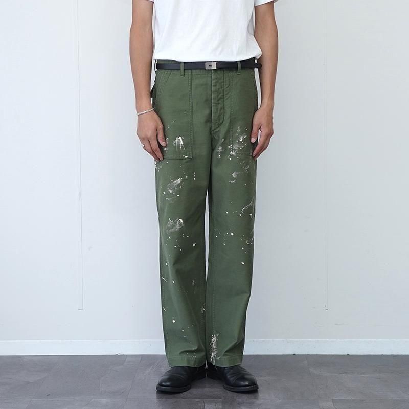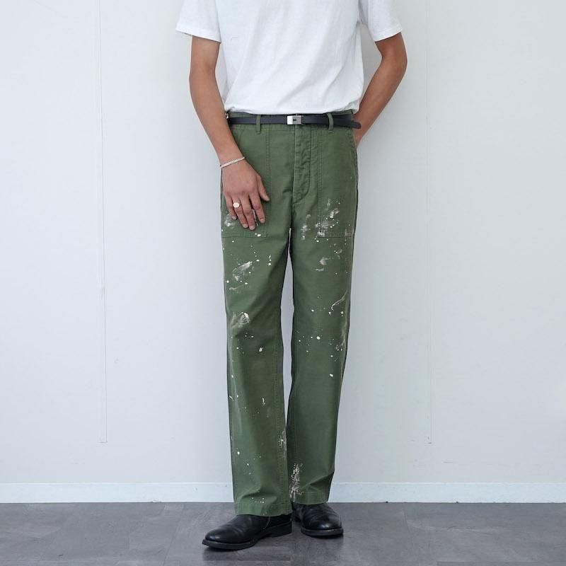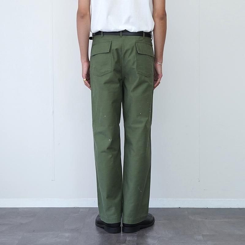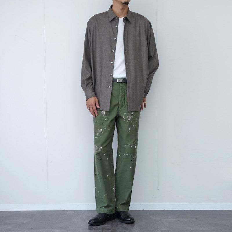 経糸にはエジプト産の超長綿「フィンクスコットン」を3本撚り合わせた糸を使用し、膨らみと滑らかさを引き出しました。 緯糸には粗野な太番手のムラ糸を打ち込むことで、ナチュラルな風合いを持たせたバギーサテン素材です。 さらに、裏面を丁寧に起毛加工し、心地よいぬくもりを加えています。 古着のような味わい深い外観ながら、上質な原料と仕立てによる洗練された風合いが特徴です。 製品では1点1点丁寧に部分的にブリーチアウトした独特な色味が際立つアイテムです。 今季のカジュアル部門のパンツでは、1番推している一本。 あえて粗野なムラ糸を打ち込むことで、武骨さとナチュラルさを演出。サテン地なのにどこか“土っぽい”質感。 一本一本、職人による手作業で色抜きされたフェードカラー 【バイヤーズコメント】 これたしか、展示会でめちゃくちゃいいよね〜ってスタッフと話したんです。 だけどそんなにオーダーしてないんだよね。 なんでなんだろう?急に欲しくなってます。 【スタッフコメント】 これはマストで個人オーダーしました。 久しぶりに新品の軍パンを購入。 ヴィンテージのベイカーパンツも欲しいんですが、このブリーチ加工の上手さは唯一無二。 武骨過ぎず、ほんのりクリーンなバランス感はAURALEEの真骨頂。 革靴やシャツ、テーラードジャケットと合わせたり、カシミヤのニットと着るのが楽しみです。 モデル身長184cm 体重64kg 着用サイズ4 SIZE(cm) 3:ウエスト78 股上28.5 股下74.5 ワタリ32 裾幅23 4:ウエスト82 股上29 股下76 ワタリ33 裾幅23.5 QUALITY COTTON100%