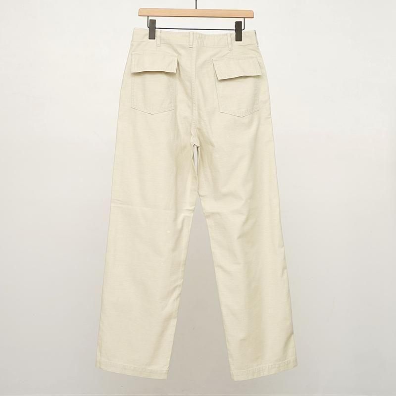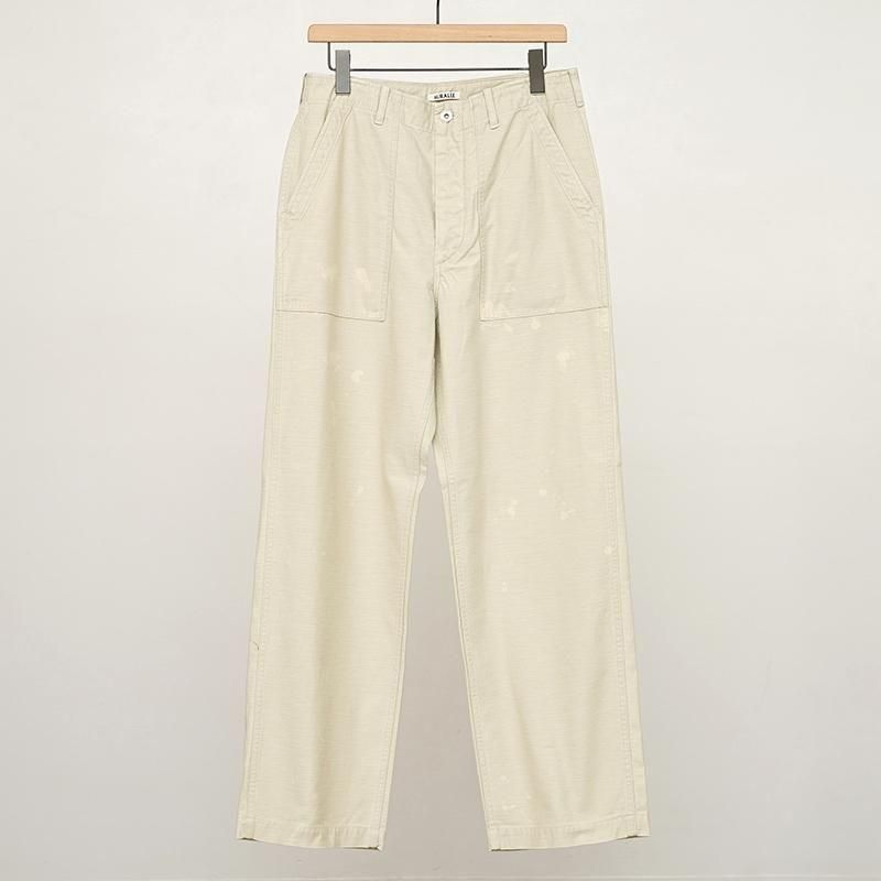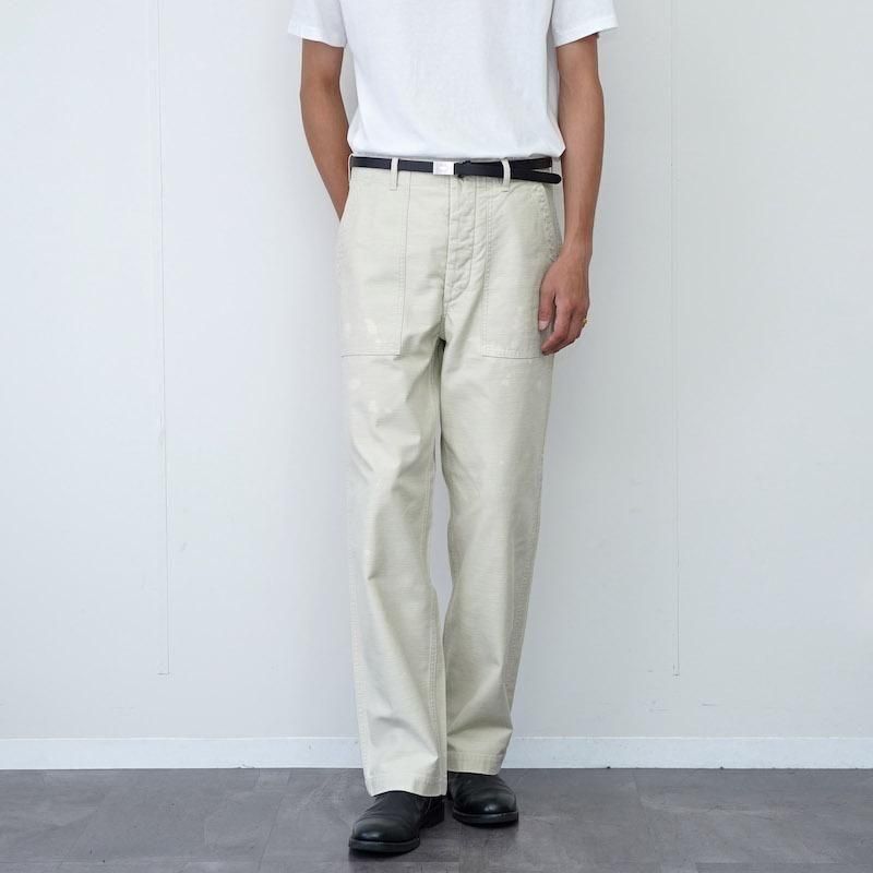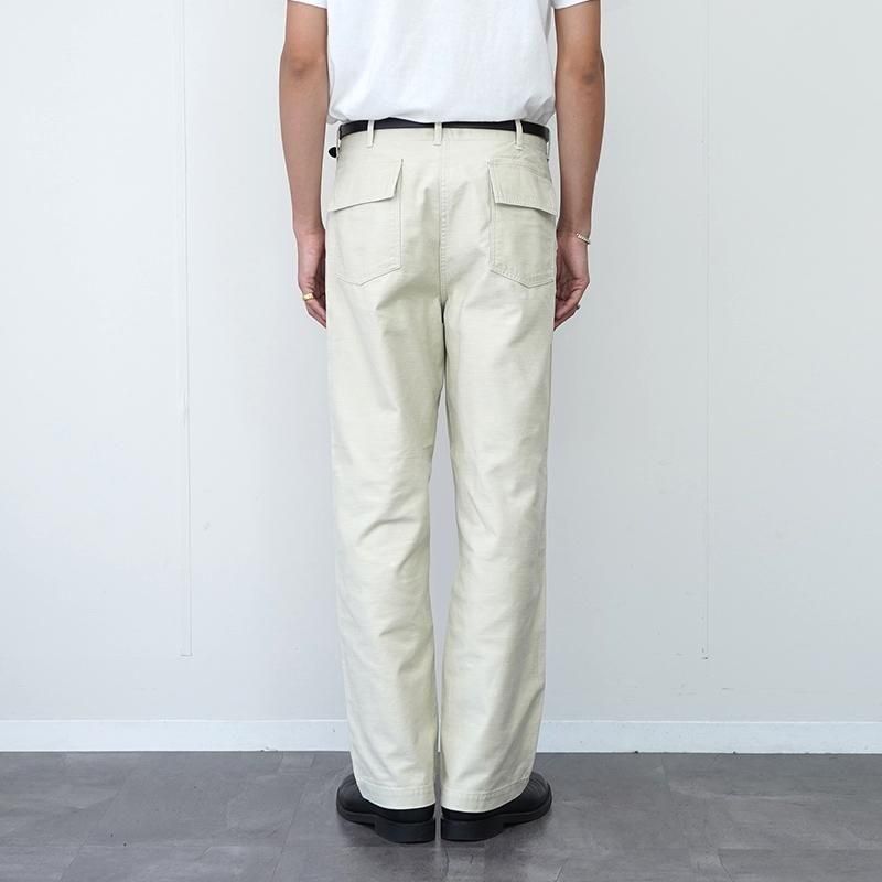 経糸にはエジプト産の超長綿「フィンクスコットン」を3本撚り合わせた糸を使用し、膨らみと滑らかさを引き出しました。 緯糸には粗野な太番手のムラ糸を打ち込むことで、ナチュラルな風合いを持たせたバギーサテン素材です。 さらに、裏面を丁寧に起毛加工し、心地よいぬくもりを加えています。 古着のような味わい深い外観ながら、上質な原料と仕立てによる洗練された風合いが特徴です。 製品では1点1点丁寧に部分的にブリーチアウトした独特な色味が際立つアイテムです。 今季のカジュアル部門のパンツでは、1番推している一本。 あえて粗野なムラ糸を打ち込むことで、武骨さとナチュラルさを演出。サテン地なのにどこか“土っぽい”質感。 一本一本、職人による手作業で色抜きされたフェードカラー 【バイヤーズコメント】 これたしか、展示会でめちゃくちゃいいよね〜ってスタッフと話したんです。 だけどそんなにオーダーしてないんだよね。 なんでなんだろう?急に欲しくなってます。 でも社内にもルールがあって2週間残ってないと買えないんです。 これは買えないだろうな〜残念だけど。 【スタッフコメント】 これはマストで個人オーダーしました。 久しぶりに新品の軍パンを購入。 ヴィンテージのベイカーパンツも欲しいんですが、このブリーチ加工の上手さは唯一無二。 武骨過ぎず、ほんのりクリーンなバランス感はAURALEEの真骨頂。 革靴やシャツ、テーラードジャケットと合わせたり、カシミヤのニットと着るのが楽しみです。 モデル身長184cm 体重64kg 着用サイズ4 SIZE(cm) 3:ウエスト78 股上28.5 股下74.5 ワタリ32 裾幅23 4:ウエスト82 股上29 股下76 ワタリ33 裾幅23.5 QUALITY COTTON100%
