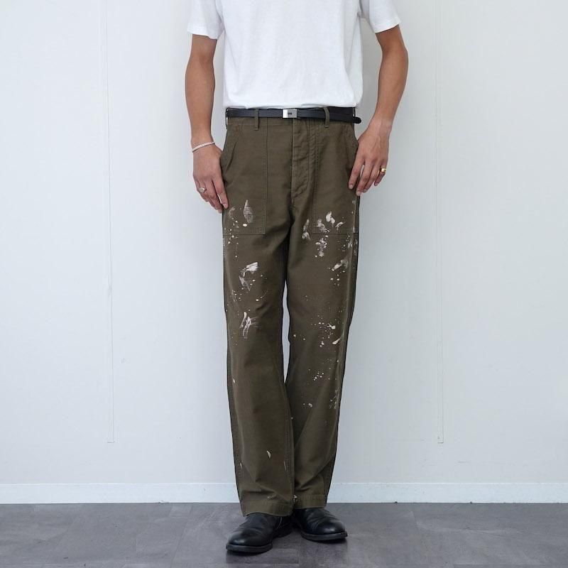 経糸にはエジプト産の超長綿「フィンクスコットン」を3本撚り合わせた糸を使用し、膨らみと滑らかさを引き出しました。 緯糸には粗野な太番手のムラ糸を打ち込むことで、ナチュラルな風合いを持たせたバギーサテン素材です。 さらに、裏面を丁寧に起毛加工し、心地よいぬくもりを加えています。 古着のような味わい深い外観ながら、上質な原料と仕立てによる洗練された風合いが特徴です。 製品では1点1点丁寧に部分的にブリーチアウトした独特な色味が際立つアイテムです。 今季のカジュアル部門のパンツでは、1番推している一本。 あえて粗野なムラ糸を打ち込むことで、武骨さとナチュラルさを演出。サテン地なのにどこか“土っぽい”質感。 一本一本、職人による手作業で色抜きされたフェードカラー 【バイヤーズコメント】 これたしか、展示会でめちゃくちゃいいよね〜ってスタッフと話したんです。 だけどそんなにオーダーしてないんだよね。 なんでなんだろう?急に欲しくなってます。 でも社内にもルールがあって2週間残ってないと買えないんです。 これは買えないだろうな〜残念だけど。 【スタッフコメント】 これはマストで個人オーダーしました。 久しぶりに新品の軍パンを購入。 ヴィンテージのベイカーパンツも欲しいんですが、このブリーチ加工の上手さは唯一無二。 武骨過ぎず、ほんのりクリーンなバランス感はAURALEEの真骨頂。 革靴やシャツ、テーラードジャケットと合わせたり、カシミヤのニットと着るのが楽しみです。 モデル身長184cm 体重64kg 着用サイズ4 SIZE(cm) 3:ウエスト78 股上28.5 股下74.5 ワタリ32 裾幅23 4:ウエスト82 股上29 股下76 ワタリ33 裾幅23.5 QUALITY COTTON100%