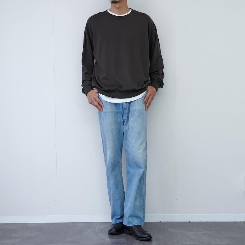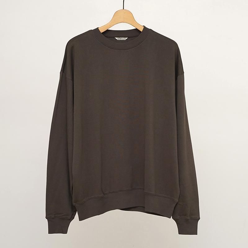 表糸に超長綿であるピマコットンを使用し、最大限の膨らみを持たせるために綿の状態で加工してから紡績し、ハイゲージ機械で編み上げたスウェット素材です。 加工過程で毛羽を溶かす処理を施し、綺麗な落ち感と滑らかで柔らかな風合いに仕上げました。 軽やかでありながらも豊かな膨らみと、上質な触感が特徴です。 ニットライクな質感を持つ最高級スウェット。 【バイヤーズコメント】 こういうシンプルなスエットこそauraleeの真骨頂じゃないかと個人的に思っています。 スエットから始まったと言ってもいいんじゃないかと思うんです。 素材の質に合わせた身幅、着丈、襟ぐりの広さなどのサイズ感がとてもうまい。 カットソーは指示寸を出して作っているタイプのデザイナーだと思うので こういう指示寸重視のデザイナーだから、すべてのプロダクトの完成度が高いんだと思います。 フィルメランジェ時代の岩井さんのスエットを同じ品番を3枚買ったんです。 どれも10年ぐらい着ました。やっぱり他にはない新しいバランスがあったんです。 そういう細かいバランス感をぜひ感じて欲しいアイテムです。 モデル身長184cm 体重64kg 着用サイズ4 SIZE(cm) 3:着丈67 肩幅59 身幅60 袖丈59 4:着丈70 肩幅 61 身幅63 袖丈61 QUALITY COTTON100%