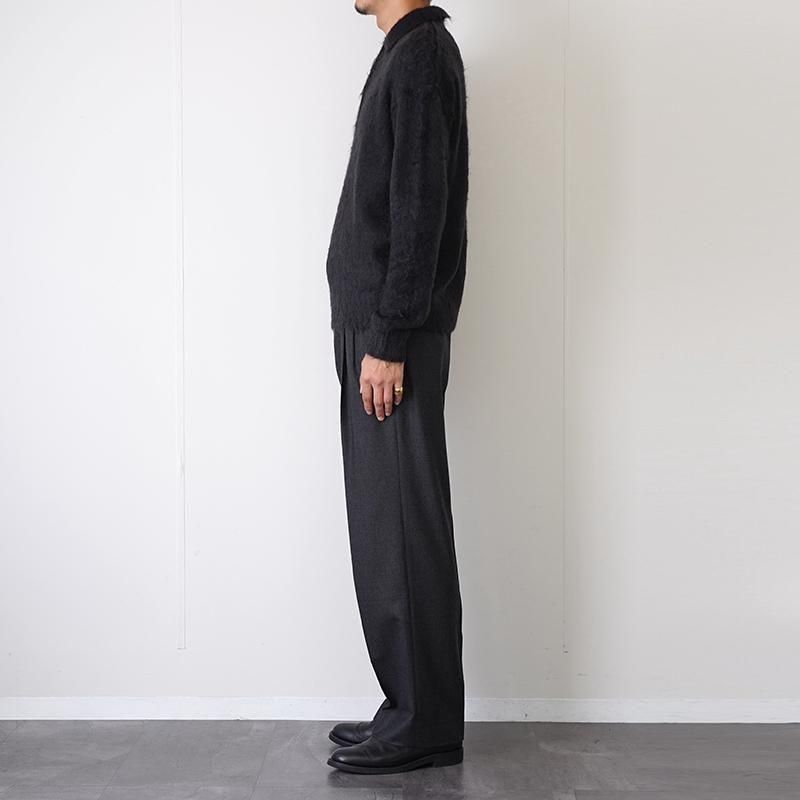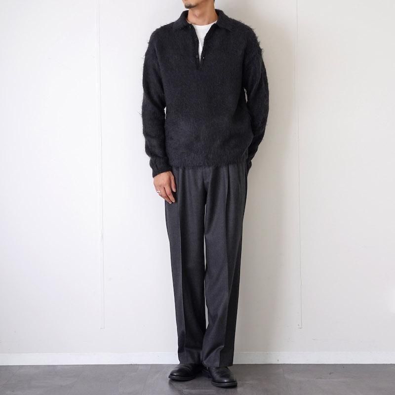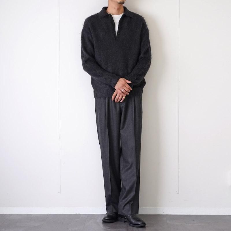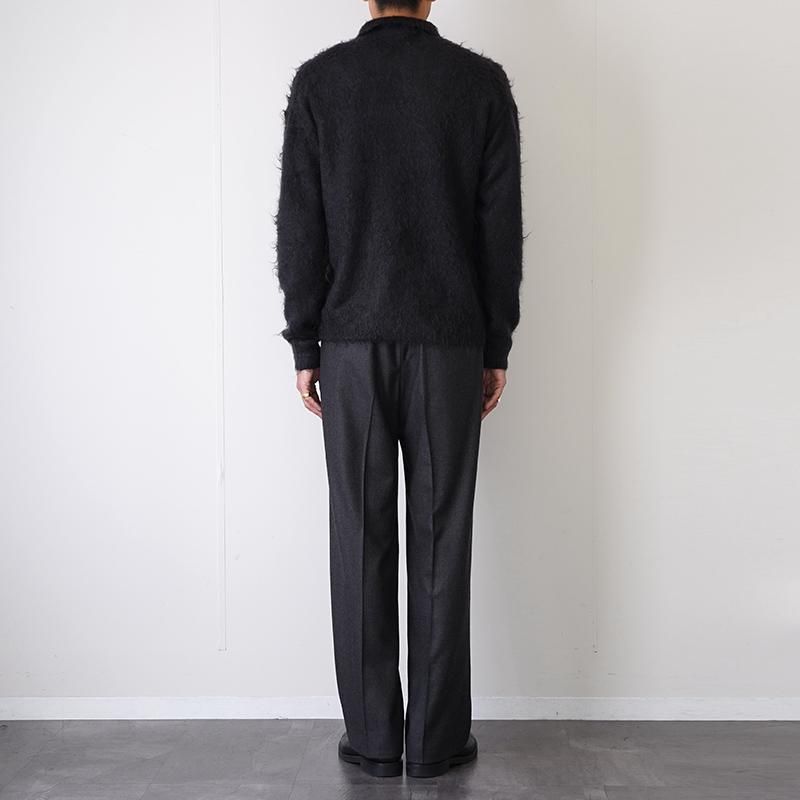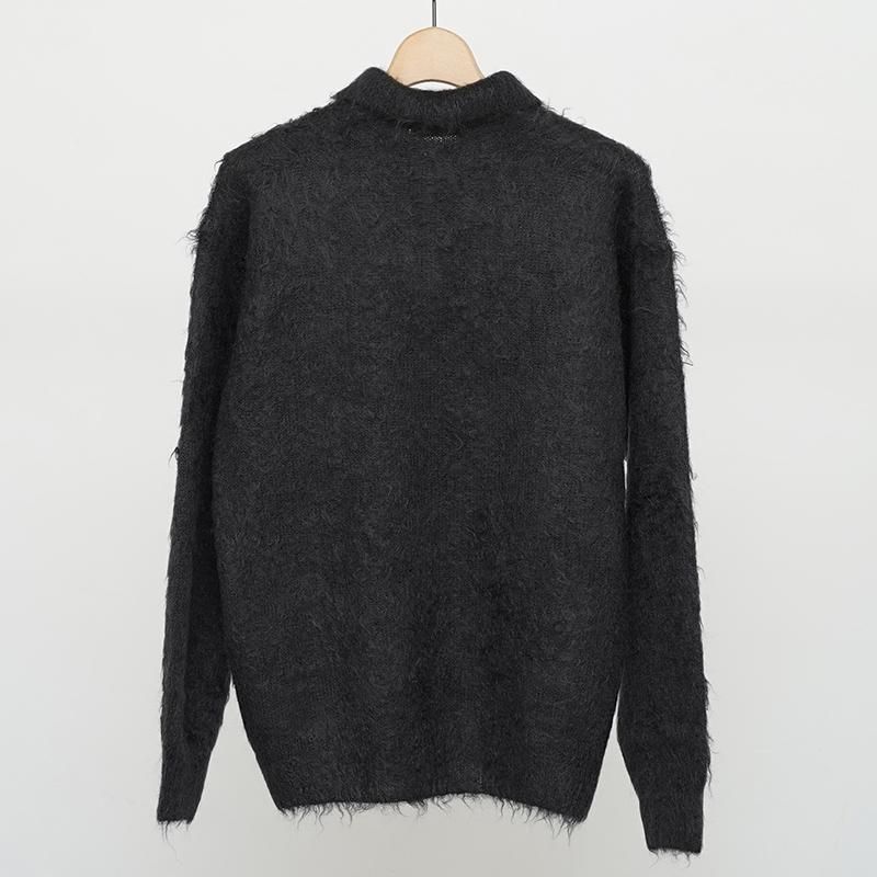 南アフリカ産の柔らかなスーパーキッドモヘヤを甘撚りに紡績し、芯糸には柔らかな天然ウールを使用して編み上げた、ふんわりとした温かみを感じる極上のモヘヤニットです。 軽やかで滑らかな肌触りに加え、モヘヤ特有の美しい光沢感と、ボリューム感のある長い毛足が特徴です。 ポロ型のデザインで上品さと抜け感を兼ね備え、アウターを脱いだ時も主役になる存在感 モヘヤの艶と、空気のような軽さが魅力。 本来はダレやすいモヘアニットですが、芯糸にウールを使用することで、ダレづらくなり柔らかさも両立を実現しています。 OLIVEは深みのある柔らかさを、INK BLACKは静かな艶と洗練を纏う印象に。 【バイヤーズコメント】 とにかくずっと人気のシリーズ。軽くて今の日本の気候だとこれくらいライトだと使いやすいです。 あと値段がいつまでも安い。他のブランドはモヘヤすごく高いですよね。 冬場のコーディネートのアクセントにとてもいいです。 サイズが選べるうちにどうぞ。 モデル身長184cm 体重64kg 着用サイズ4 SIZE(cm) 3:着丈66 肩幅48.5 身幅54 袖丈56.5 4:着丈68 肩幅50 身幅56 袖丈58 QUALITY MOHAIR60% WOOL40%