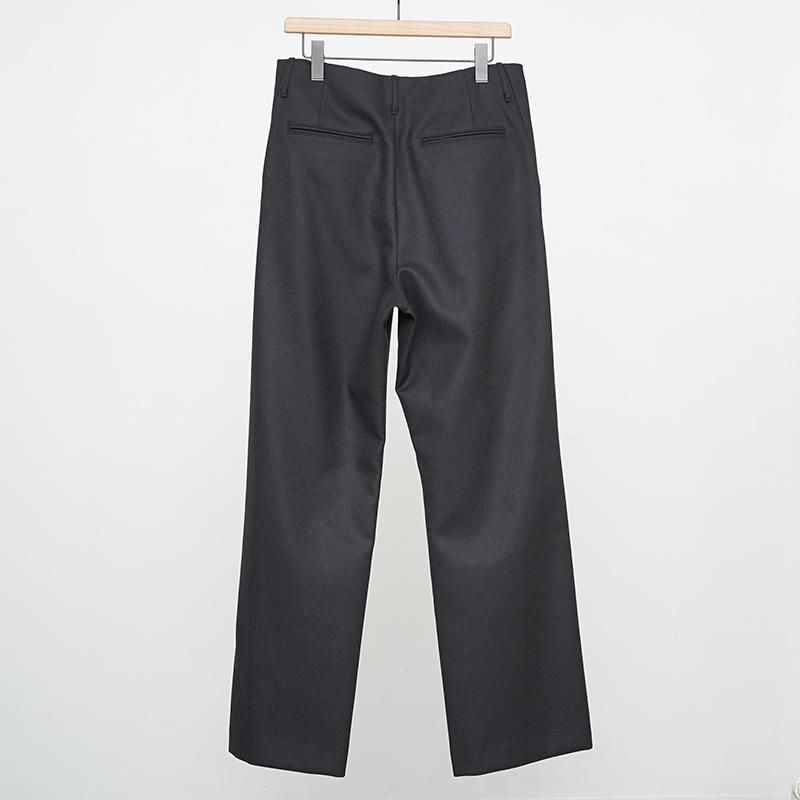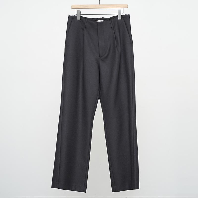 Super130'sの上質な原料を使用した梳毛糸を贅沢に使い、二重織組織でしっかりと織り上げました。 その後、繊細で丁寧な縮絨工程を経て、きめ細やかな毛羽が凝縮されたメルトンに仕上げました。 繊細な光沢と滑らかな風合いの極上の素材です。 メルトンの概念を覆す、しっとりとした穿き心地ながら、二重織でしっかりと織り上げた贅沢なライトメルトンの艶と滑らかさは一級品。 【バイヤーズコメント】 こんないい感じのパンツ一回穿いたら、冬は毎日穿きたくなってしまいます。 カシミヤもそうだけど、こういう品番がauraleeに沼らせられてしまうのだと思います。 2、3年は綺麗に穿いて、その後の2、3年はラフに使って、そのあとは最高の家着として使うと良いかと。 自身も8年ぐらい前に買ったヤク100%のスラックスを冬は贅沢な家着として使っているのですが あと10年ぐらい穿けそうです。 それぐらい原料が良いとダメにならないよって言いたかったのです。 あっという間に25awも最終盤です。よろしくお願いします。 モデル身長184cm 体重64kg 着用サイズ4 SIZE(cm) 3:ウエスト82 股上31.5 股下76.5 ワタリ34.5 裾幅26 4:ウエスト86 股上32 股下78 ワタリ35.5 裾幅26.5 QUALITY WOOL100% LINING:CUPRO:100%
