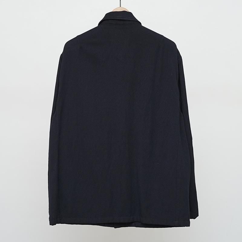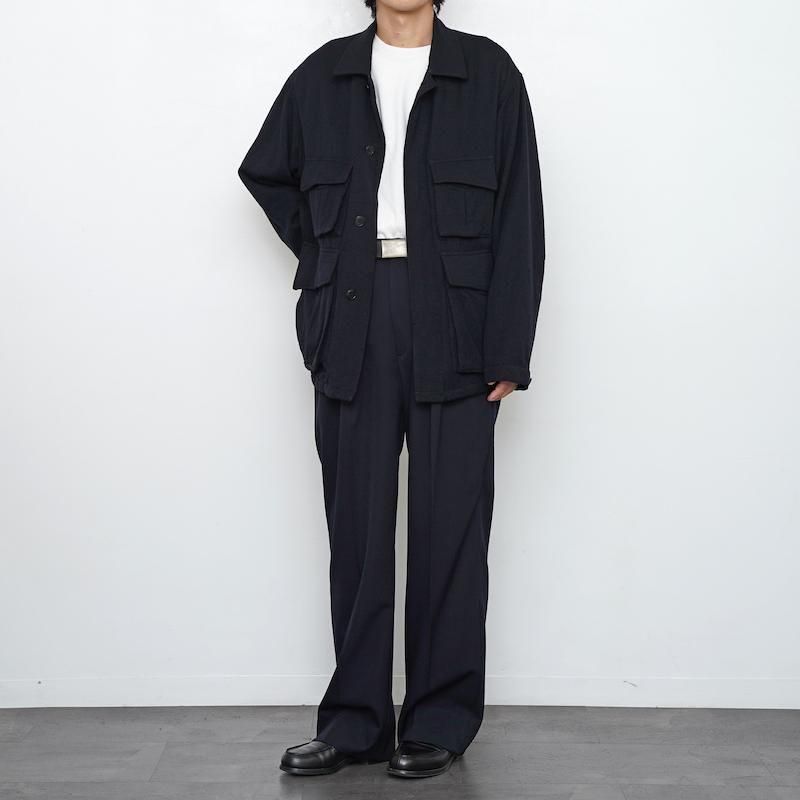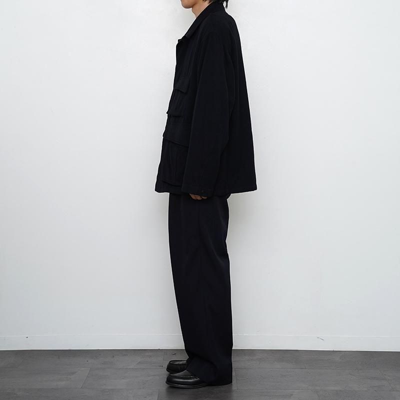 粗野でクラシックなムードとソフトな印象の共存を目指し、いくつかのミリタリーやハ ンティングの要素をバランス良くを崩しながら仕上げたジャケット。 身幅やアームホー ムにゆとりを持たせた一重仕立て、製品洗いによる抜け感が特徴。上質でソフトな素材感と相まった心地良い着用感を感じられる1枚です。 タテ糸にレーヨン、ヨコ糸にメリノウールとカシミヤの混紡糸を使用したツイル素材。 レーヨン特有の落ち感とカシミヤの滑らかな風合いがミックスしたソフトで滑らかな質感が特徴です。 仕上げの洗い込みによって柔らかく肌あたりの良い風合いをさらに引き出しています。 モデル身長173cm 体重59kg 着用サイズ3 SIZE(cm) 3:着丈75 肩幅51 身幅60 袖丈61 4:着丈77 肩幅53 身幅62 袖丈63 QUALITY WOOL47% RAYON44% CASHMERE9%
