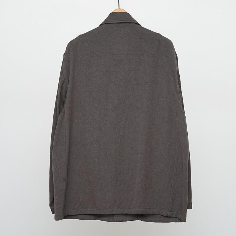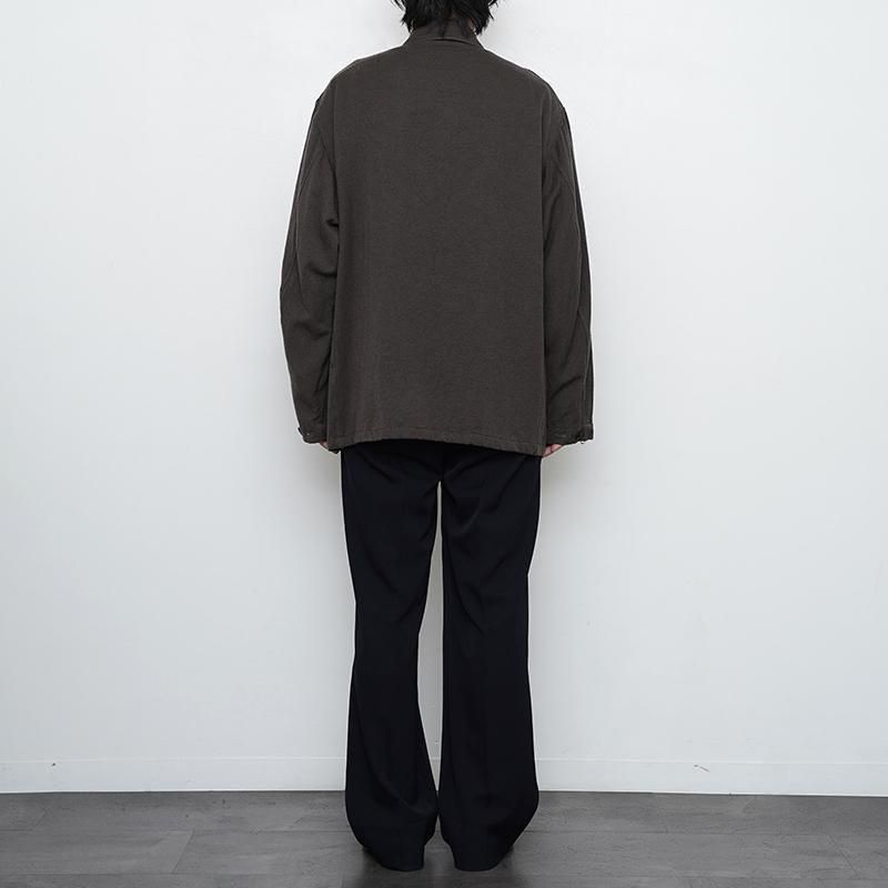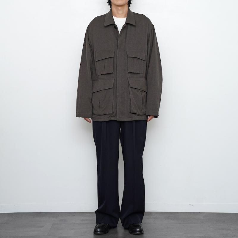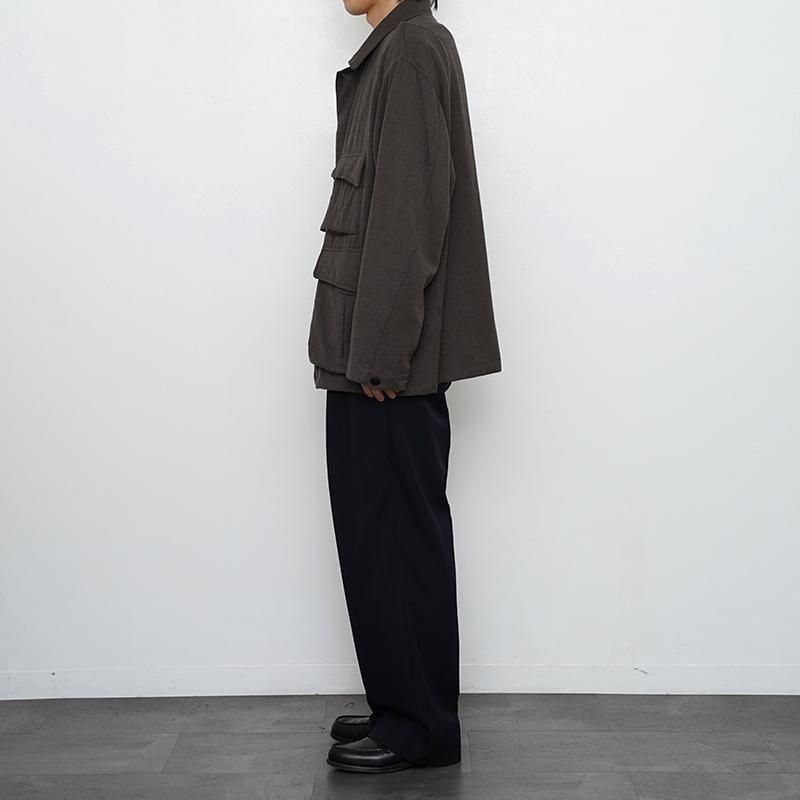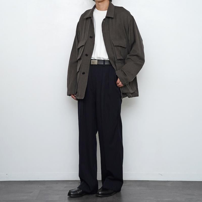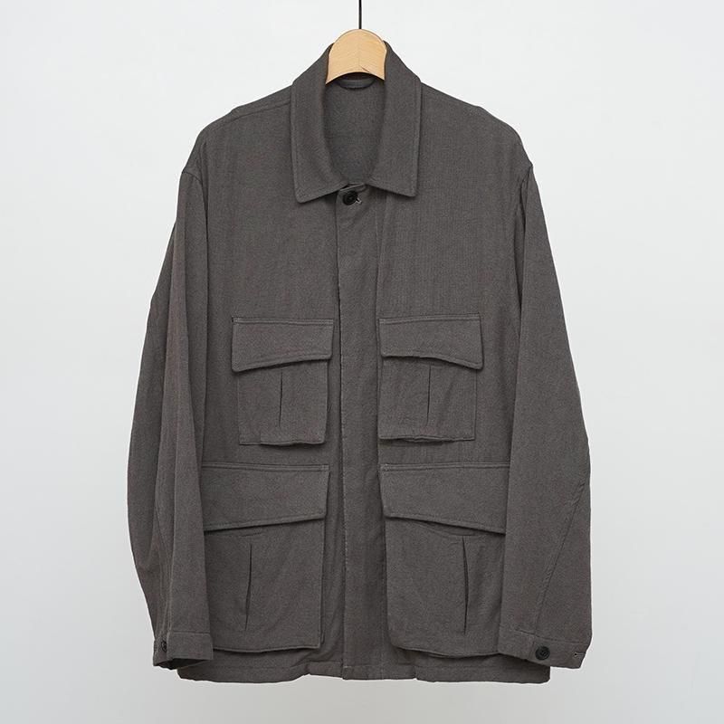 粗野でクラシックなムードとソフトな印象の共存を目指し、いくつかのミリタリーやハ ンティングの要素をバランス良くを崩しながら仕上げたジャケット。 身幅やアームホー ムにゆとりを持たせた一重仕立て、製品洗いによる抜け感が特徴。上質でソフトな素材感と相まった心地良い着用感を感じられる1枚です。 タテ糸にレーヨン、ヨコ糸にメリノウールとカシミヤの混紡糸を使用したツイル素材。 レーヨン特有の落ち感とカシミヤの滑らかな風合いがミックスしたソフトで滑らかな質感が特徴です。 仕上げの洗い込みによって柔らかく肌あたりの良い風合いをさらに引き出しています。 モデル身長173cm 体重59kg 着用サイズ3 SIZE(cm) 3:着丈75 肩幅51 身幅60 袖丈61 4:着丈77 肩幅53 身幅62 袖丈63 QUALITY WOOL47% RAYON44% CASHMERE9%