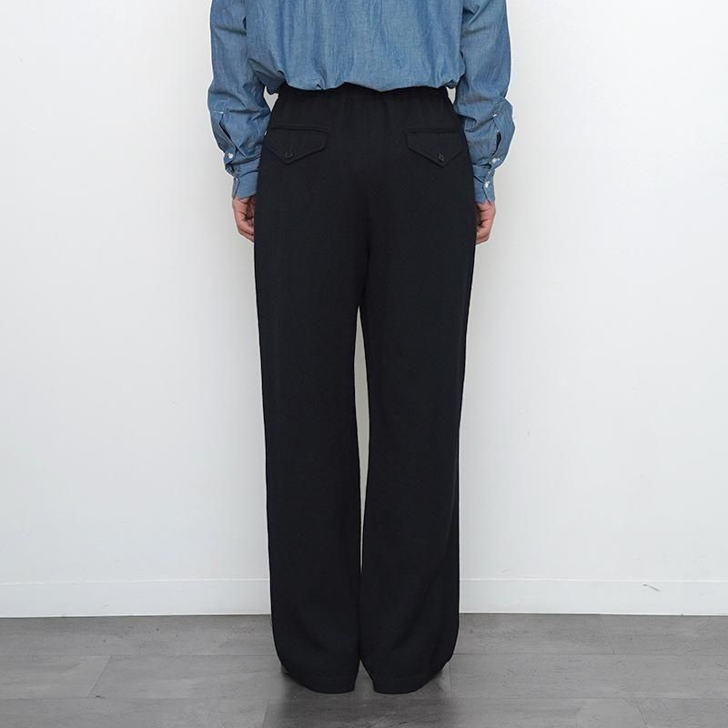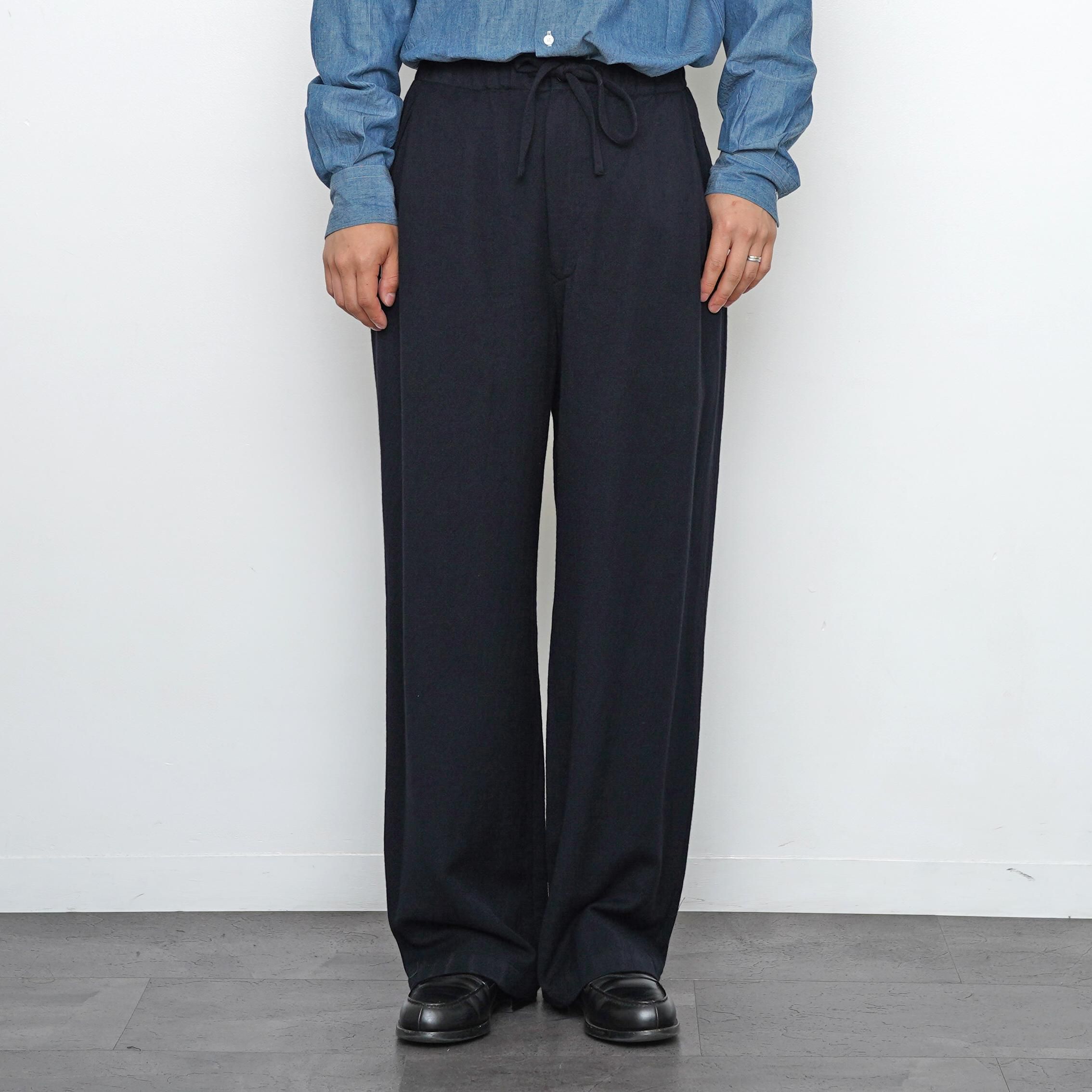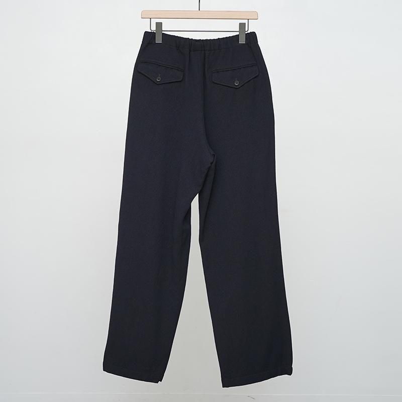 ドレスパンツを日常使いするイメージで再構築したイージートラウザー。 ゆとりのある股上と中太ストレートのシルエット、両サイドにさり気なく入った深めのアウトタック が特徴で、ゴムとドローコード仕様のウエストは心地良い着用感を感じられます。 タテ糸にレーヨン、ヨコ糸にメリノウールとカシミヤの混紡糸を使用したツイル素材。 レーヨン特有の落ち感とカシミヤの滑らかな風合いがミックスしたソフトで滑らかな質感が特徴です。 仕上げの洗い込みによって柔らかく肌あたりの良い風合いをさらに引き出しています。 モデル身長173cm 体重59kg 着用サイズ3 SIZE(cm) 3:ウエスト71 股上32 股下75 ワタリ37 裾幅23.5 4:ウエスト76 股上32 股下76 ワタリ38 裾幅24 QUALITY WOOL47% RAYON44% CASHMERE9%