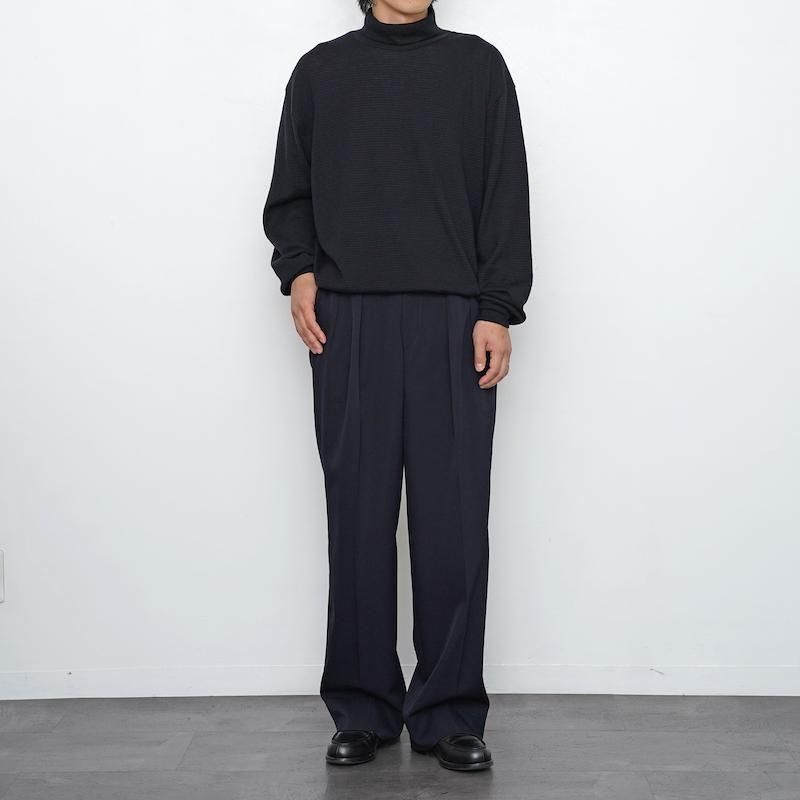 分量をとって心地よいバランスに仕上げたタートルネックプルオーバー。 そのまま首元にラフに溜めても折り返してもバランスの良いネック設定。 見え方はハイゲージニットの雰囲気ながら、ウォッシャブル原料によるカットソー仕様のため、イージーケアが可能。 着用感を感じさせないストレスフリーな軽さも特徴です。 これまでややコンパクトなフォルムにアップデートしています。 表面にウォッシャブル加工したスーパー120'sメリノウール、裏面にコットンを使用し、特殊な編機で編み立てた ”裏毛の裏糸なし” という変形編みの天竺。 キックバックが強く、厚みと膨らみがあるのが特徴です。 今季は変形の編み地と逆撚りの原料を利用した不均一なボーダー柄を新たに作成しました。 モデル身長173cm 体重59kg 着用サイズ3 SIZE(cm) 3:着丈65 肩幅55 身幅59 袖丈58 4:着丈66 肩幅55 身幅63 袖丈59 QUALITY WOOL57% COTTON43%