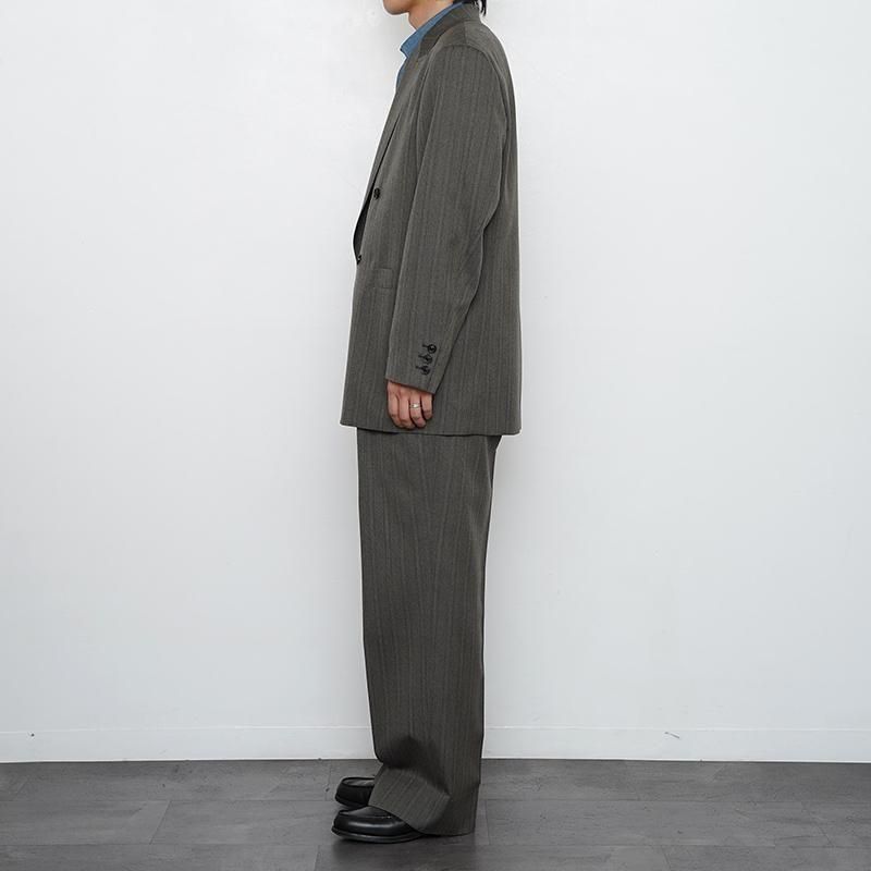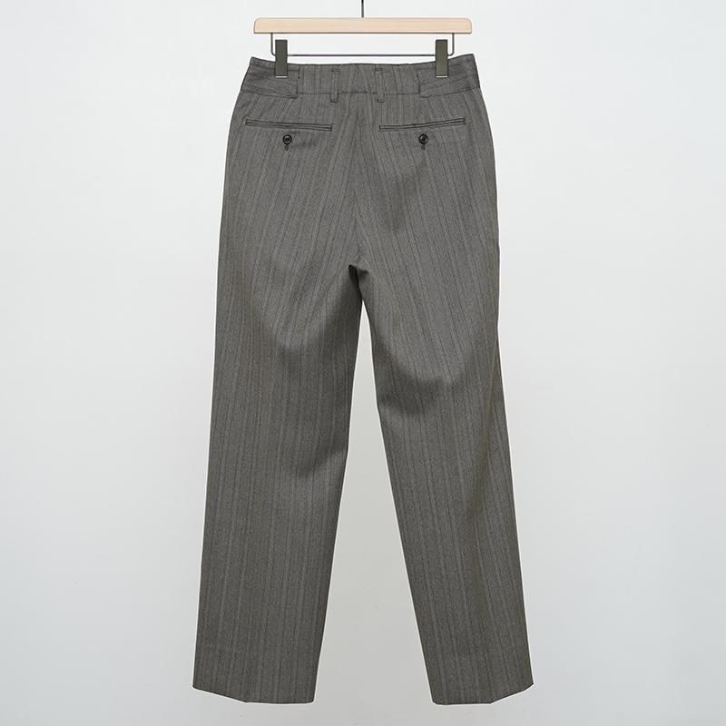 フレンチビンテージのスラックスから着想したトラウザーズ。 ウエスト部分の⻑いベル トループが深い2本のインタックが特徴。 緩やかなテーパードシルエットとクラシカル な雰囲気を纏っています。同素材のジャケットとのセットアップはもちろん、単体でも 日常的なスタイルにも取り入れやすいトラウザーズです。 super130'sの梳毛ウール原料を使用したヘリンボーンストライプ。異なる色のTOP糸を 撚り杢糸にして製織する事で、深みのある色味と表情に仕上げています。原料本来の上 質な風合いに加え、整理工程にてハリコシ感を与える加工を施し、シワになりにくく上 品な光沢感を付与しています。 モデル身長173cm 体重59kg 着用サイズ3 SIZE(cm) 3:ウエスト75 股上31 股下74 ワタリ36 裾幅25 4:ウエスト81 股上31 股下75 ワタリ37 裾幅26 QUALITY SHELL: WOOL100% KNEE LINING: CUPRO100%