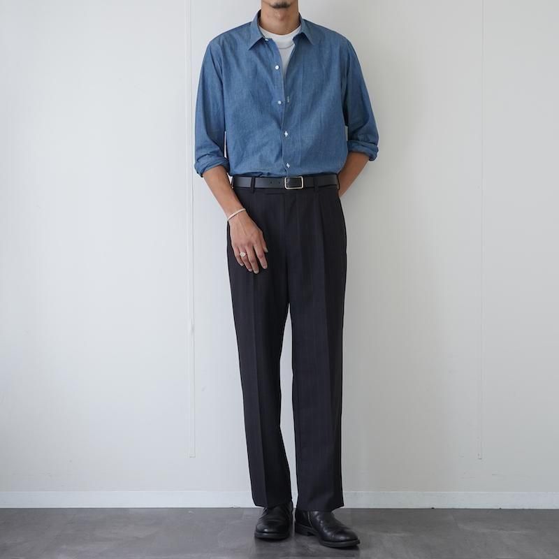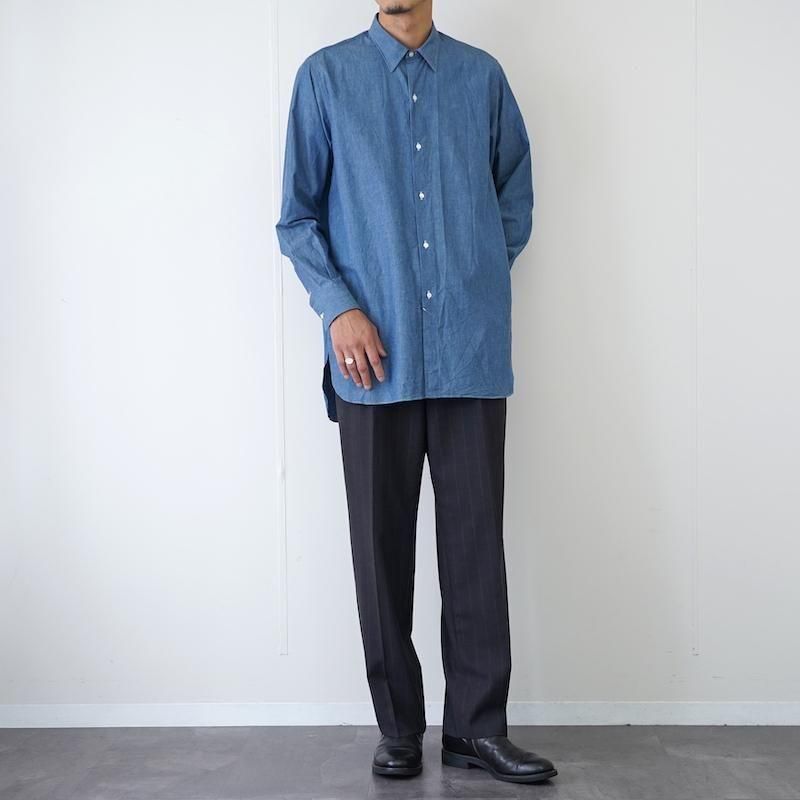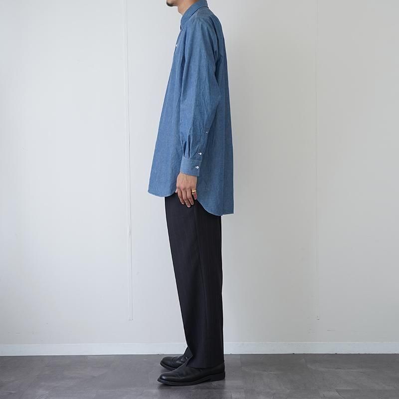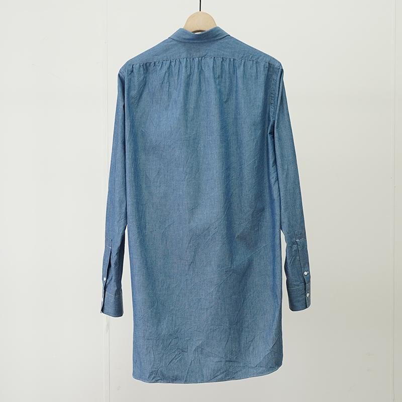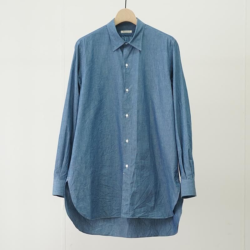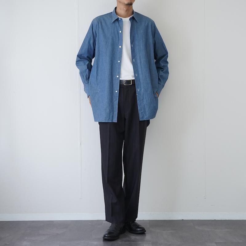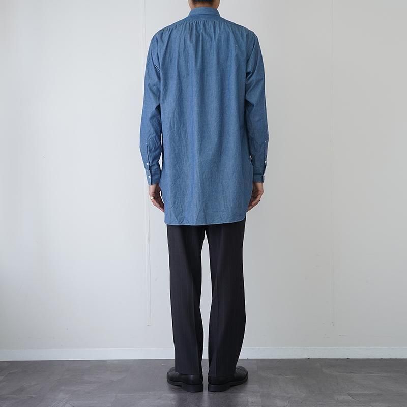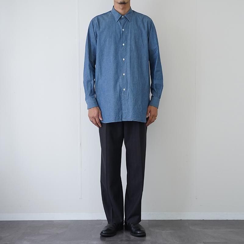 1940年代フランスのオーダーシャツをベースにデザインされたレギュラーシャツです。 襟は古くからある台襟の芯抑えステッチを採用しながら、小ぶりなレギュラーカラーで現代的に仕上げました。 背ヨークは上品なギャザーを取り入れ全体にふんわりとしたシルエットを持たせました、またテールを長めにカットすることでその包み込む様なシルエットを活かしています。 裾の着回しでボリュームを出す事でリラックス感を表現し、品良く様々なスタイルで着用することが出来ます。 生地には国内で生産されたシャンブレー素材を使用。 少し肉厚なのが特徴で着込んで行くうちに肌触りは更に良くなり、程良いカジュアルな表情を見せてくれます。 モデル身長184cm 体重64kg 着用サイズ2 SIZE(cm) 1:前着丈83 後着丈88 肩幅44 身幅58 袖丈65 2:前着丈84 後着丈90 肩幅45 身幅60 袖丈66 QUALITY COTTON100%