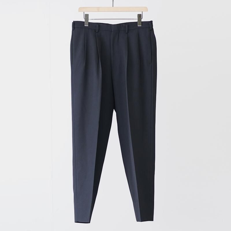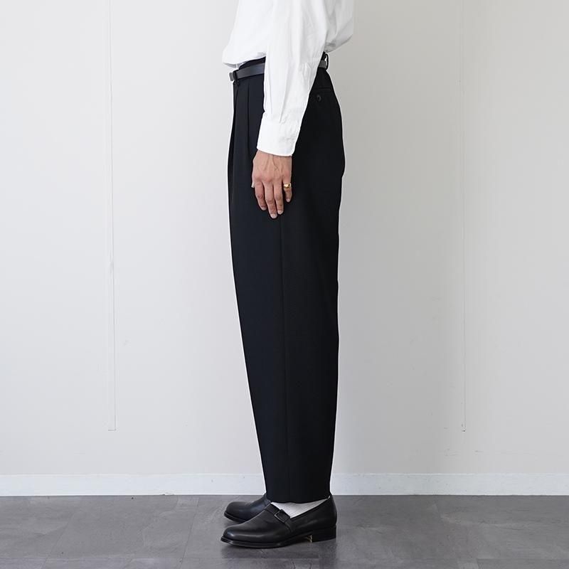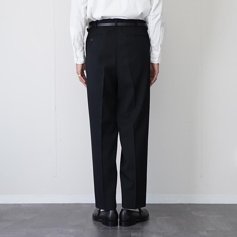創業150年の尾州の機屋に別注したフォーマル由来の伝統的なギャバジンの生地を使用。 生地は度詰めで織り上げられており、高密度なハリ感とシャープな輪郭を備えているため、脚線を美しく見せる精緻なフォルムが特徴。 腿から裾にかけて程よいテーパードを施すことで脚のラインを強調。無駄をそぎ落としたデザインはミニマルでありながら、素材の質感と裁断の美しさを最大限に引き立てます。 同素材のジャケットとセットアップで持っておくのもオススメです。 モデル身長184cm 体重64kg 着用サイズ3 SIZE(cm) 1:ウエスト75 股上30 股下74 ワタリ34 裾幅19 2:ウエスト78 股上31 股下75 ワタリ33 裾幅19.5 3:ウエスト82 股上32 股下76 ワタリ34 裾幅20 QUALITY WOOL100%