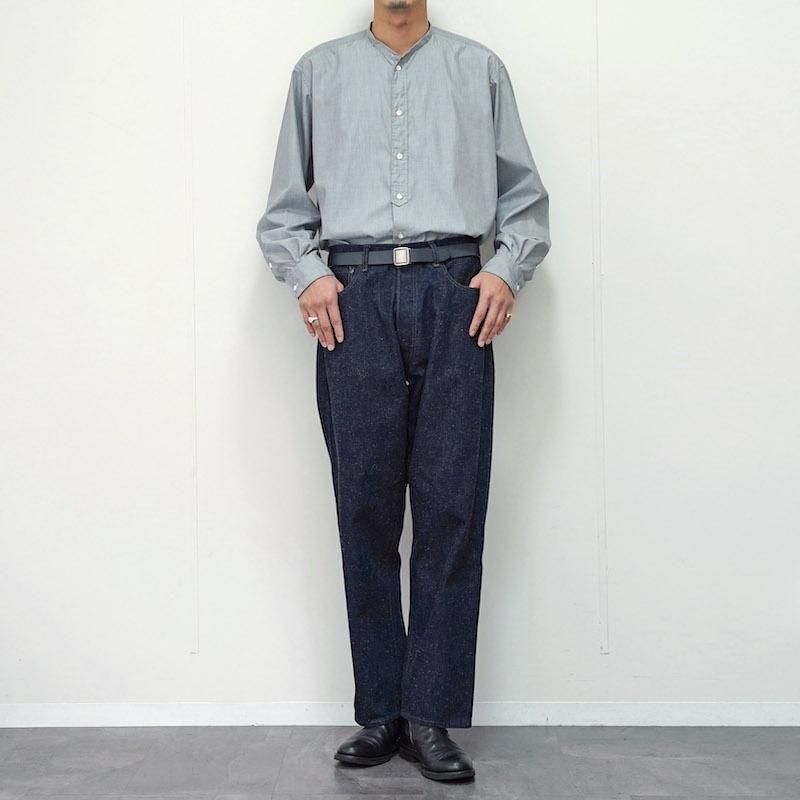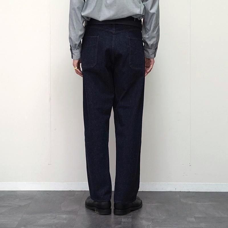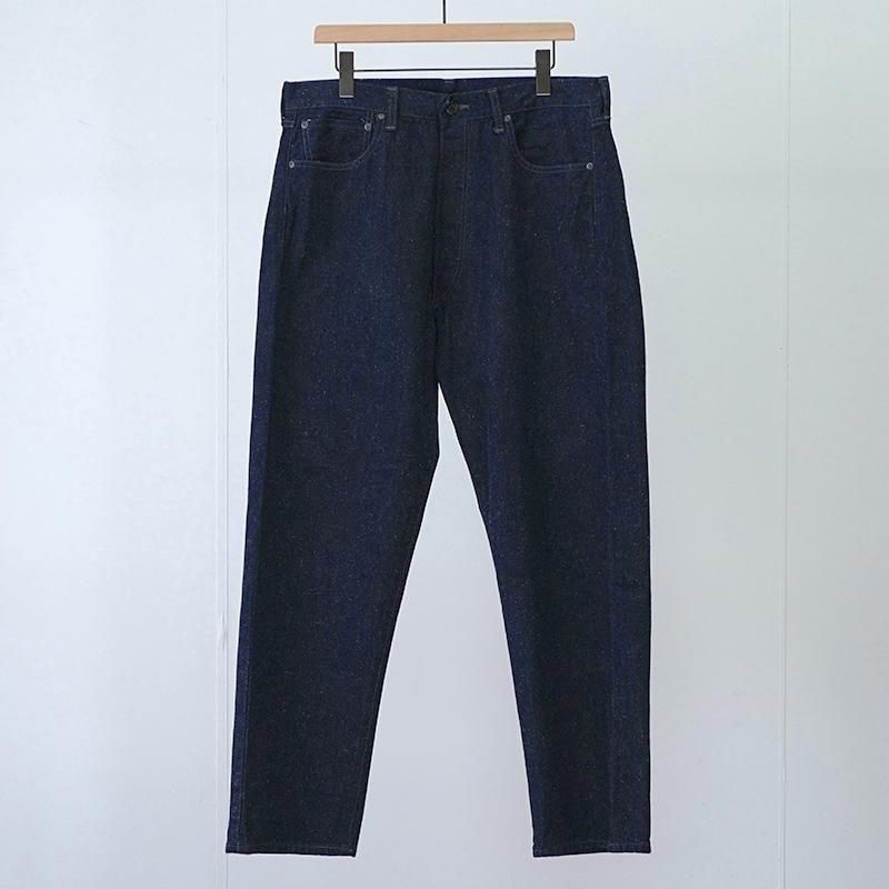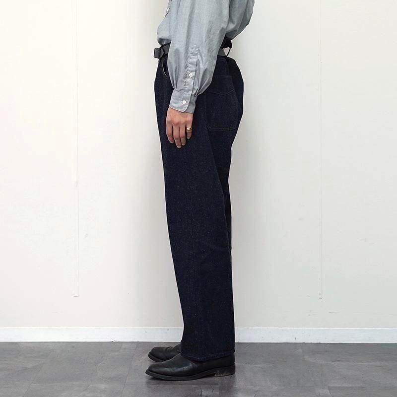 1960sフランス製のデニムパンツを元にデザインしたルーズフィットの5ポケットデニム。 生地を糸染色からオリジナルで作成したスペシャルな生地です。 縦糸に天然藍でロープ染を施し、緯糸に綿とヘンプの混紡糸を打ち込んだoutilオリジナルのd.ingigo。 ミミがオリーブ色なのもデニム好きには魅力的。 深めの股上とゆとりのある腰回りから、裾にかけて緩やかに絞られたワイドテーパードシルエット。 合わせるトップスもシューズも選ばず、汎用性抜群。 ベルトを通してウエストをギュッと絞って着用するのがオススメ。 ご自身にあったレングスで是非お選びください。 ヴィンテージの雰囲気をたっぷりと含んだクラシカルな1本です。 モデル身長184cm 体重64kg 着用サイズ3 SIZE(cm) 1:ウエスト81 股上34 股下72 ワタリ37 裾幅22.5 2:ウエスト84 股上34 股下75 ワタリ37 裾幅23 3:ウエスト88 股上35 股下77 ワタリ37裾幅23.5 QUALITY COTTON84% HEMP16% COW LEATHER