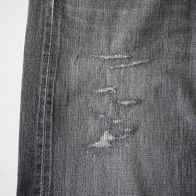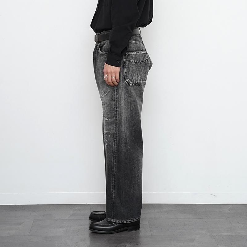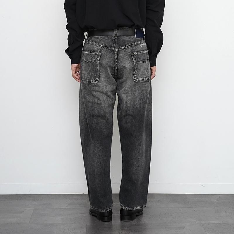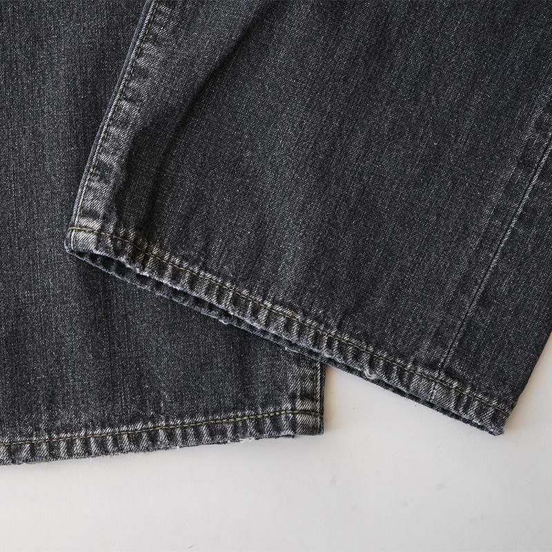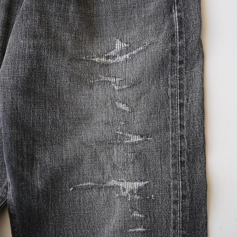 縦糸にロープ染色を施し、横糸にはヘンプとコットンの混紡糸を使用したオリジナルデニム生地に、リペア加工をプラス。ヴィンテージの風合いをさらに引き立て、穿き込んだような味わいを持たせています。 生地のドライなタッチとUSED感に、パッチやステッチで施された補修のディテールが重なり、個性のある表情に仕上がっています。 ベースとなるのは 1960sフランス製デニムパンツ。ルーズフィットで後ろ姿に程よいゆとりを残しつつ、前から見ても美しいラインを保っています。 フロントのボタンフライ、インディゴレザーパッチ、丁寧に形成されたバックポケットに加え、リペア加工ならではのステッチや補強パッチがデザインポイントに。古き良きワークウェアの雰囲気を生かしながら、現代的な味わいも楽しめます。 気負わず穿けるラフさと、どこか端正な佇まい。 素材・シルエット・ディテール・リペア加工が調和した、個性豊かな一本です。 モデル身長173cm 体重59kg 着用サイズ2 SIZE(cm) 1:ウエスト79 股上32 股下69 ワタリ34 裾幅22 2:ウエスト82 股上33 股下71 ワタリ35 裾幅22.5 3:ウエスト86 股上34 股下73 ワタリ36 裾幅23 QUALITY COTTON84% HEMP16% COW LEATHER