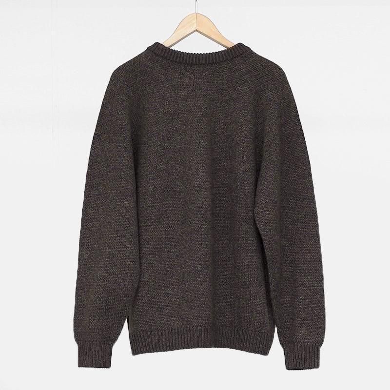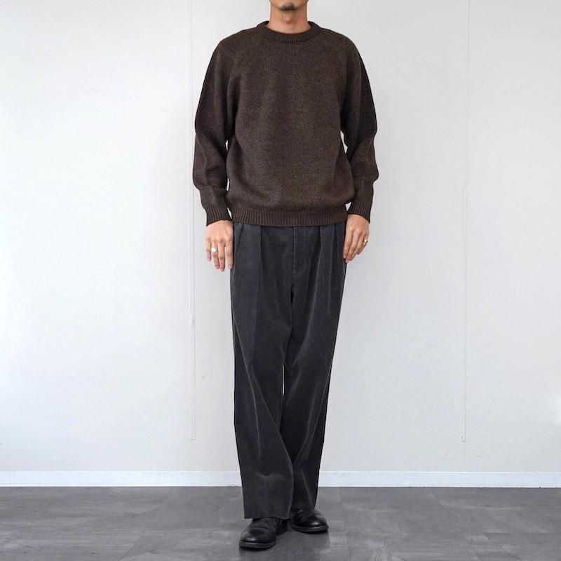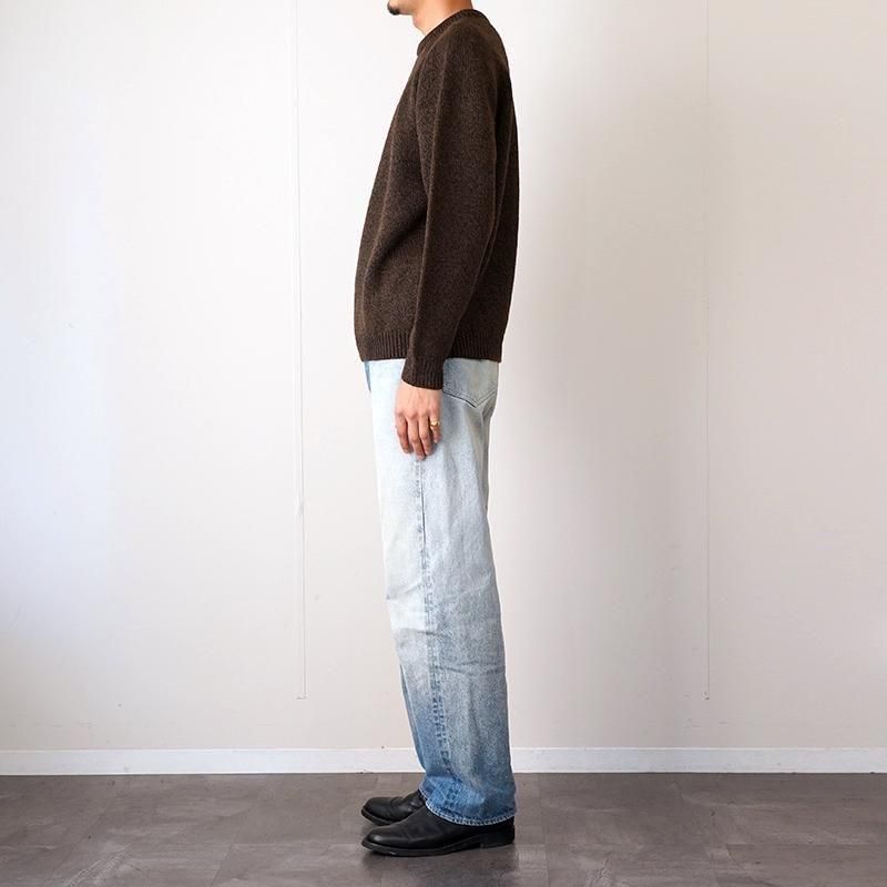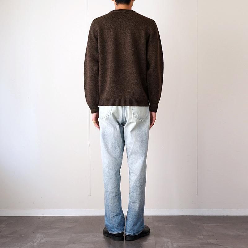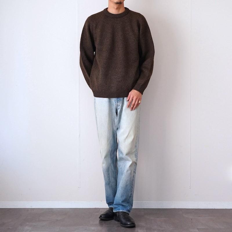 軽やかな膨らみを感じさせる、上質なウール混紡素材を使用した「SPREAD TENJIKU CREW NECK」。ミドル番手のメリノウールをベースに、ベビーアルパカの柔らかさとシルクの光沢感を撚糸することで、素材そのものに豊かな表情と深みをもたせています。