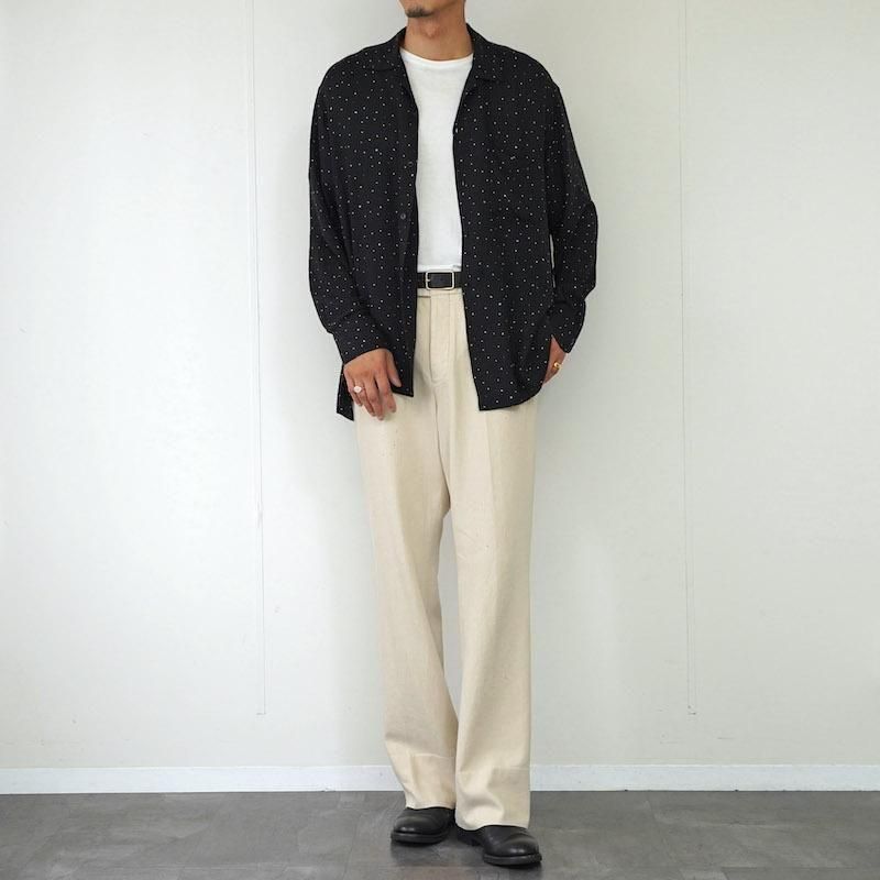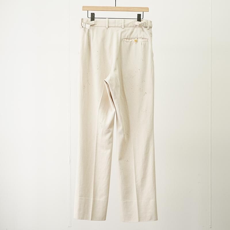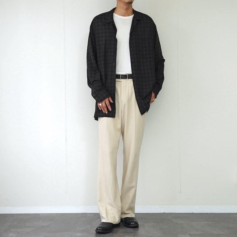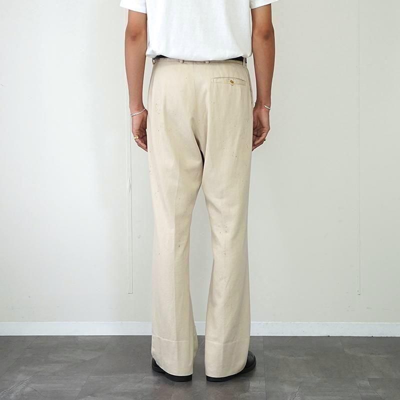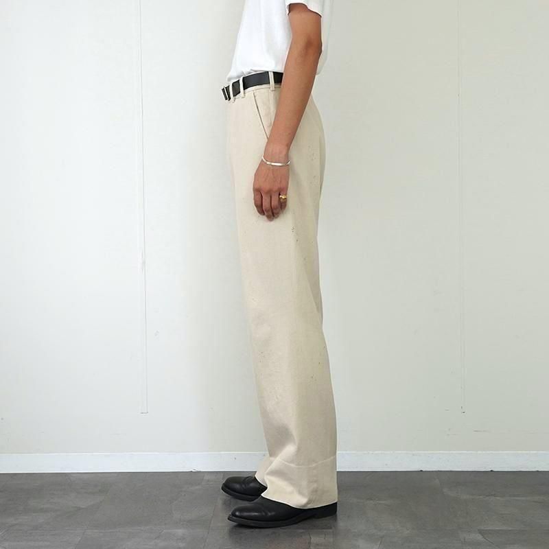 クタッとした柔らかな質感ながら、綾目はクッキリと立っている独特な風合い。生成りには油染みのような加工を所々に施し古着のように仕上げています。ブランドらしい品の良さと無骨さがバランスよく溶け込んだ1着に。 今回は綿100%のコットンツイル。 程よくゆとりを持たせた微フレアシルエットと柔らかな落ち感のある生地が、日常に寄り添いながら静かに主張するボトムスとなっています。 モデル身長184cm 体重64kg 着用サイズ2 SIZE(cm) 1:ウエスト79 股上32 股下81 ワタリ28 裾幅25 2:ウエスト82 股上32 股下83 ワタリ30裾幅25.5 QUALITY COTTON 100%