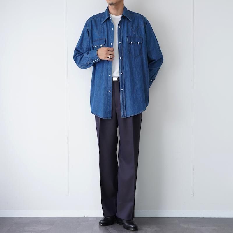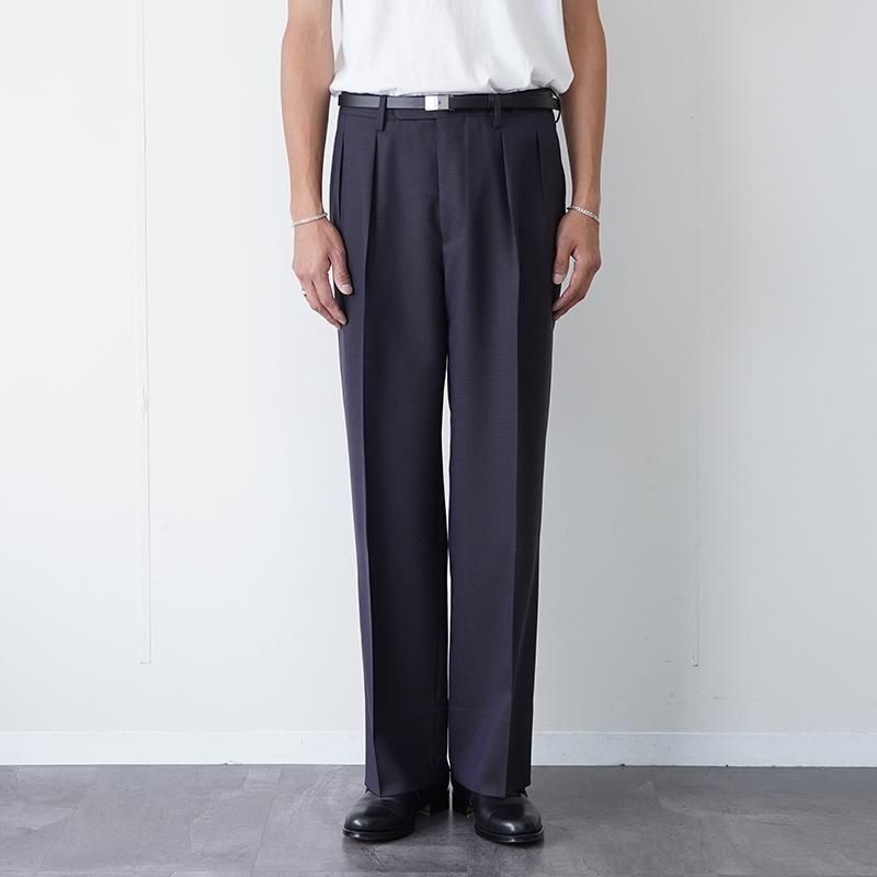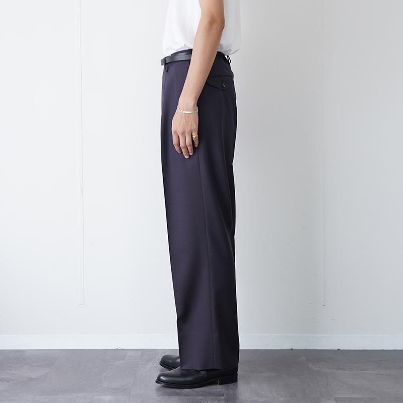 ブランドの定番であり続ける「FOREVER SLACKS」。 上質なウール×モヘヤ混紡のファブリックを採用し、強撚によってドライでシャリっとした質感を実現。程よいハリと光沢が、見た目にも立体感を生み出します。 インタックが施された2プリーツの腰回りはすっきりとシャープに仕立てられ、裾まで真っ直ぐ落ちるストレートラインが美しいシルエットを形成。 サイドアジャスター付きで、細かなウエストの調整も可能。機能性と佇まいの両立に、ブランドらしい真摯なものづくりが感じられます。 モデル身長184cm 体重64kg 着用サイズ2 SIZE(cm) 1:ウエスト79 股上31 股下75 ワタリ33 裾幅24 2:ウエスト82 股上32.5 股下77 ワタリ34.5 裾幅25 QUALITY WOOL79% KIDMOHAIR21% LINING:POLYESTER