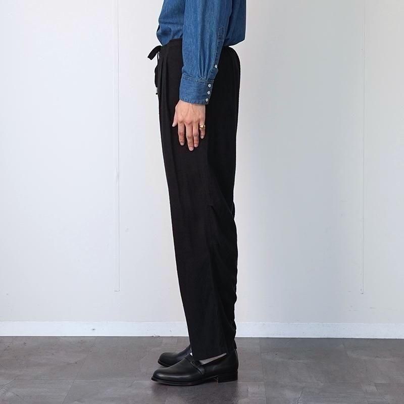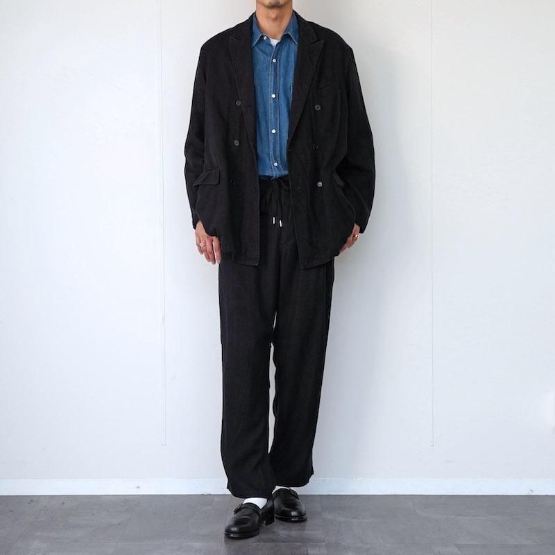 表地にはシルク100%を使用しながらも、滑らかというよりネップ感を残したドライな質感が特徴です。 上品さの中にわずかな粗野さが共存し、穿き込むほどに表情が深まる独特の風合いに仕上げられています。 ウエストはドローコード仕様で、リラックス感のある履き心地。 ゆとりを持たせたストレートシルエットが、素材の落ち感と相まって自然な動きを描きます。 裏地にはキュプラを配し、滑らかな肌あたりで快適に着用可能です。 ダブルGathered JK Silk Nelとセットアップでの着用もおすすめです。 モデル身長184cm 体重64kg 着用サイズ2 SIZE(cm) 1:ウエスト84 股上31 股下74 ワタリ36 裾幅23.5 2:ウエスト86 股上32 股下76 ワタリ39 裾幅25 QUALITY SILK100% LINING:CUPRO100%