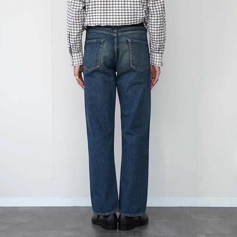 深みのあるインディゴにリアルな色落ち加工とペイント、アタリを加えることで、穿きはじめからヴィンテージさながらの存在感を放ちます。 縦ムラのある生地表情は、使い込むほどにさらに奥行きを増し、経年変化を楽しめる仕様です。 フロントはクラシックなボタンフライ仕様。バックウエストのレザーパッチやリベット使いなども本格的で、トラディショナルな要素と現代的なフィッティングが絶妙に調和しています。 腰まわりに程よい余裕を持たせつつ裾に向かって緩やかにテーパードするシルエットは、カジュアルな装いにはもちろん、ジャケットや革靴と合わせても上品に馴染みます。 モデル身長184cm 体重64kg 着用サイズ3 SIZE(cm) 1:ウエスト80 股上28 股下76 ワタリ31 裾幅20 2:ウエスト84 股上28.5 股下77.5 ワタリ31.5 裾幅21 3:ウエスト88 股上30 股下80 ワタリ32 裾幅21.5 QUALITY COTTON100%