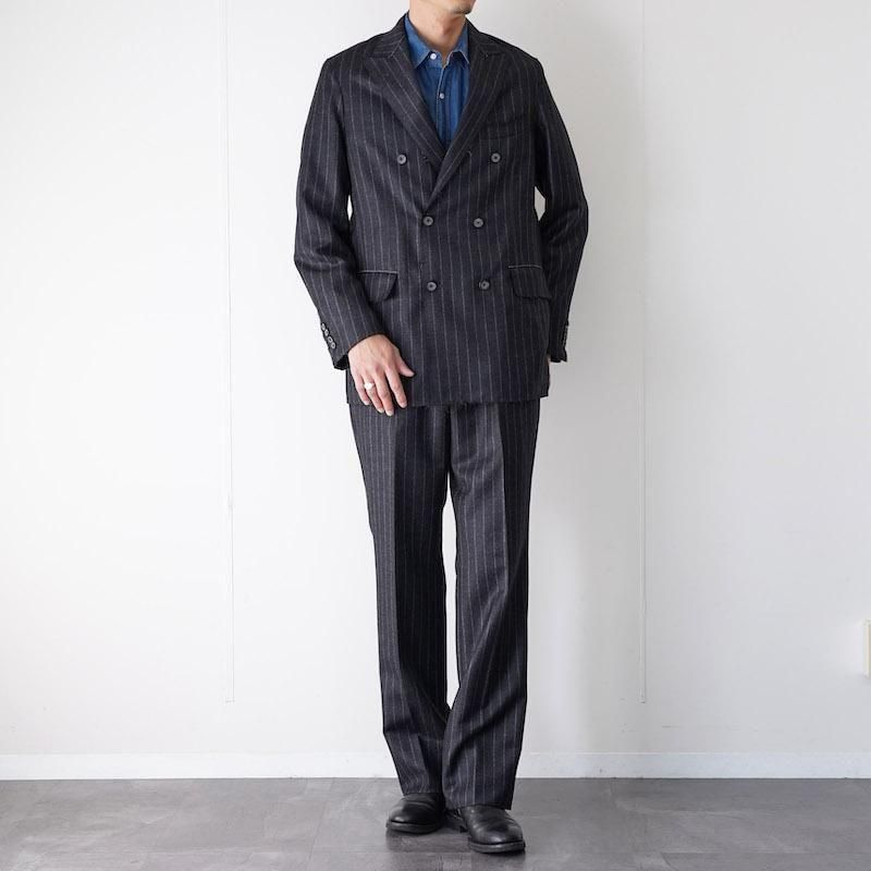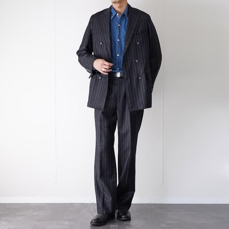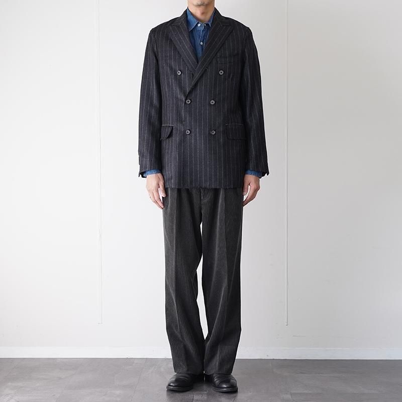 梳毛ウールにシェットランドウールを掛け合わせた生地を用いたダブルブレストジャケット。 光沢を帯びた表情の中に、粗野な風合いを宿す独特の素材感が特徴です。チャコール地にグレーストライプのウールフランネル生地は、クラシックに寄りすぎず独特な表情。 仕立ては毛芯を用いたテーラード構造をベースに、裾や縁を断ち切り仕様とすることで、伝統的な重厚感に軽快なニュアンスを加えています。 同素材の「SET UP TROUSER 3」と合わせることで、セットアップとしても着用が可能です。 モデル身長184cm 体重64kg 着用サイズ3 SIZE(cm) 1:着丈78 肩幅42 身幅52 袖丈62 2:着丈79 肩幅44 身幅54 袖丈64 3:着丈80 肩幅46 身幅56 袖丈65 QUALITY WOOL100% LINING:CUPROI100%