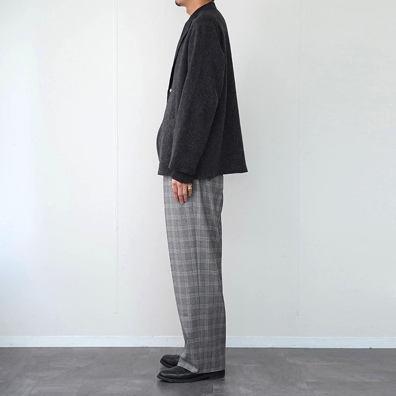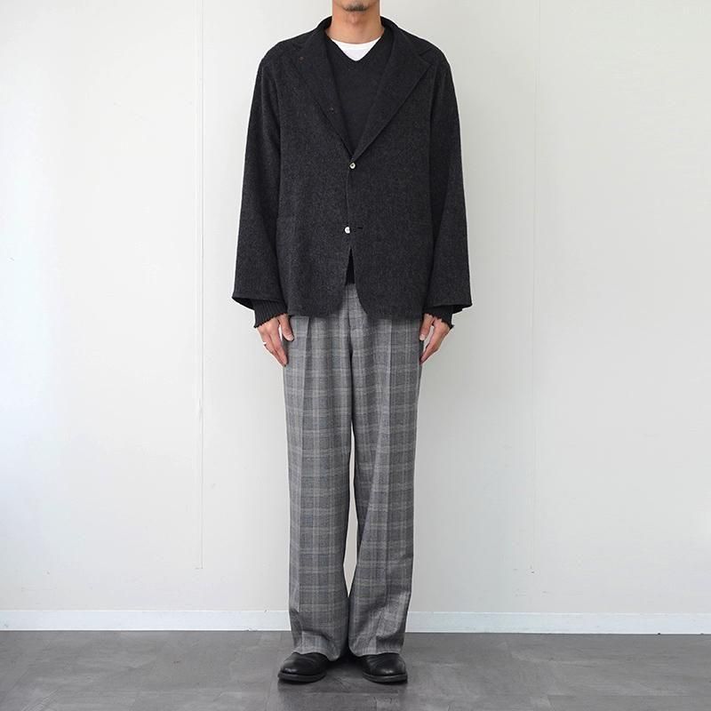 46%ウール・30%カシミヤ・24%リネンの贅沢な混率。ほどよく起毛させた柔らかな表情のジャケットです。ふんわりとしたタッチながら、リネンが入ることで軽やかさと奥行きが加わり、肌あたりの優しさと素材の存在感がうまく共存しています。 芯を強く入れず、襟の返りまで自然なラインを描くため、肩の力を抜いて羽織れるのもこのモデルの魅力。 大ぶりのパッチポケットが実用性を持ちながらも、全体はあくまで上品にまとまっています。 ハリのある重厚なジャケットとは違い、ニットカーディガンのように気楽に羽織れるのに、見え方はきちんと整う。 デニムと合わせても品よく見え、スラックスの上から羽織っても決まりすぎない。季節の立ち上がりから冬の室内アウターまで長く使える、ワードローブのなかで自然と出番が増える一枚だと思います。 モデル身長184cm 体重64kg 着用サイズ3 SIZE(cm) 1:着丈72.5 肩幅45 身幅58 袖丈58 2:着丈75 肩幅48 身幅60 袖丈59 3:着丈76 肩幅51 身幅62 袖丈59.5 QUALITY WOOL46% CASHEMERE36% LINEN24%