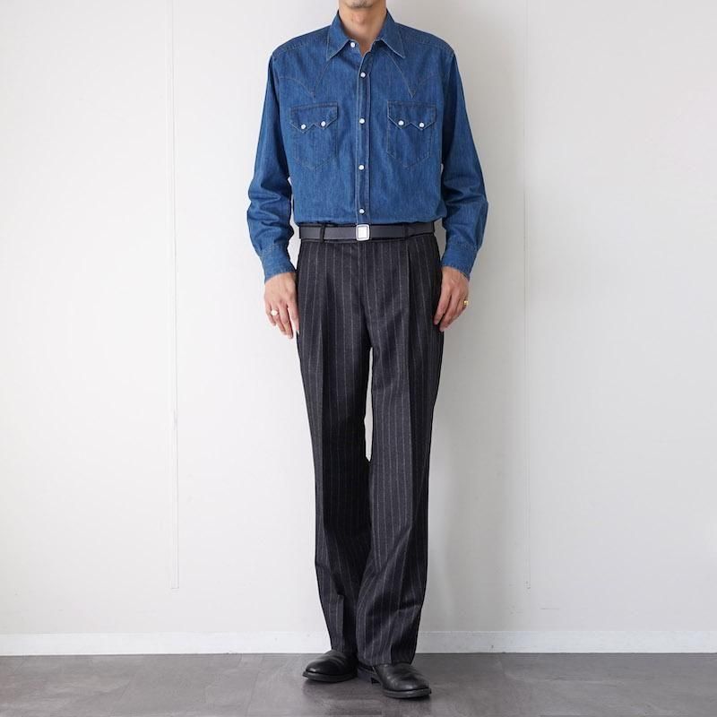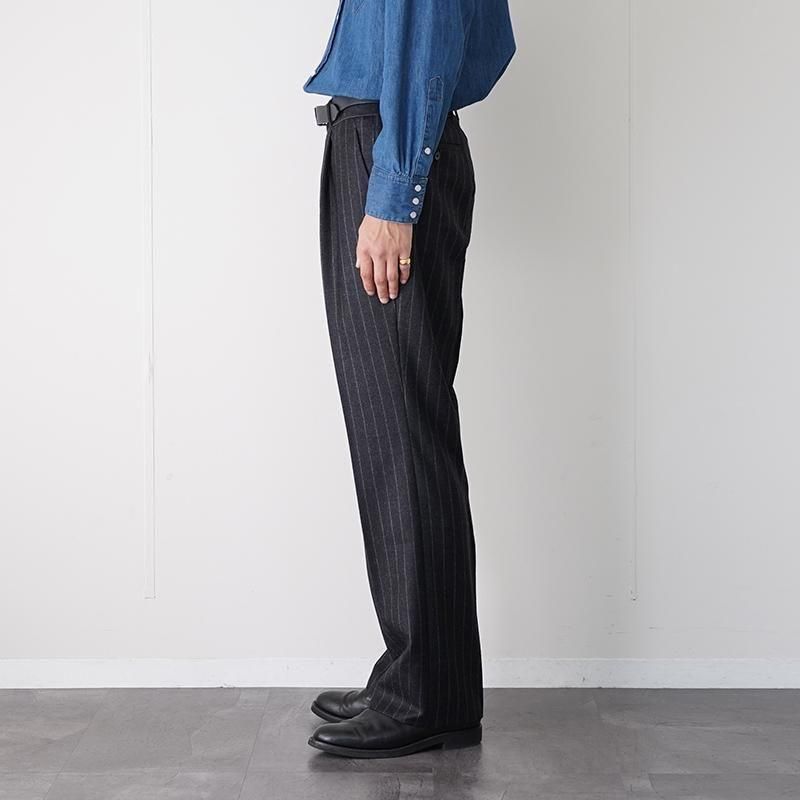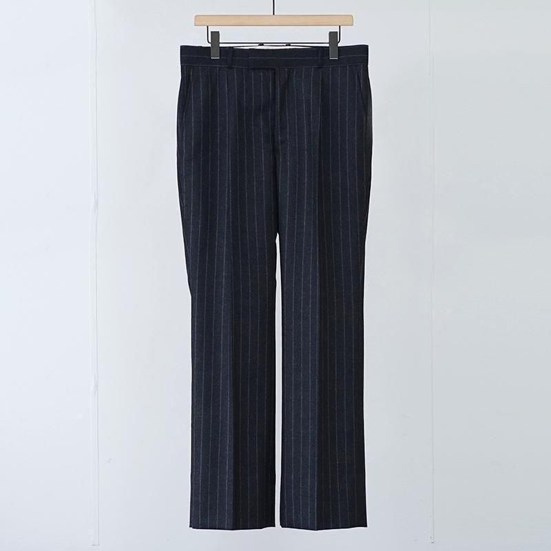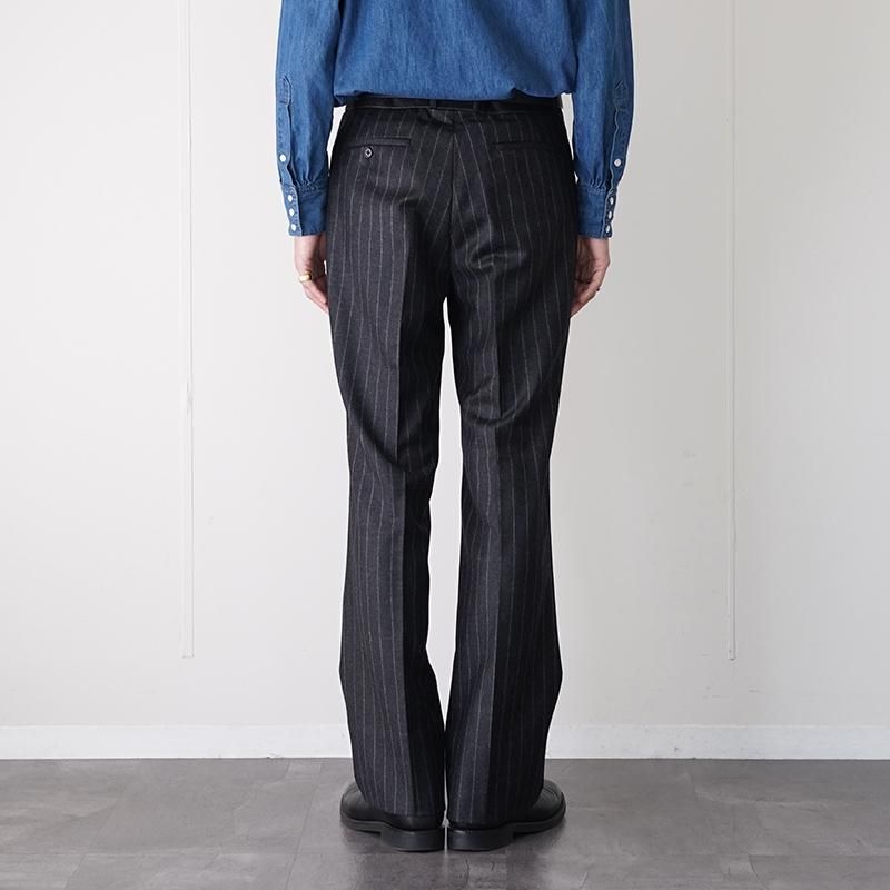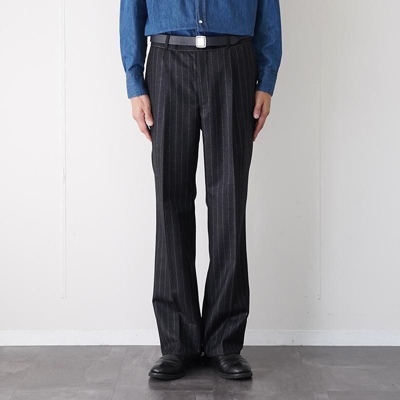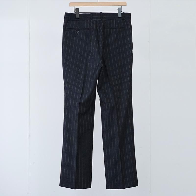 ブランド定番人気。汎用性の高い美シルエットのトラウザーです。 ワンタック入りの太すぎない絶妙なシルエットでサイズバランスも良く、どのトップスでも綺麗な収まりに。 膝下から裾にかけてストンとしているので、ボリュームのあるブーツなどでもよく合いますよ。 ニットとの合わせや、シャツスタイルにも合わせやすい幅広さの光る一本。 チャコール地にグレーストライプのウールフランネル生地は、クラシックに寄りすぎず独特な表情です。 ストライプ生地に起毛がかかってることで、かっちりし過ぎずリラックス感のある雰囲気に仕上がってます。 色で遊んだトップスや、古着のスウェットなどと合わせたカジュアルな単体使いから、ジャケット合わせの綺麗なシーンまでとマーティーらしいスタイルでお楽しみいただけます。 モデル身長184cm 体重64kg 着用サイズ3 SIZE(cm) 1:ウエスト80 股上30 股下73 ワタリ35 裾幅24 2:ウエスト82 股上31 股下76 ワタリ35 裾幅24 3:ウエスト84 股上32 股下80 ワタリ36 裾幅24.5 QUALITY WOOL100% LINING:POLYESTER100%