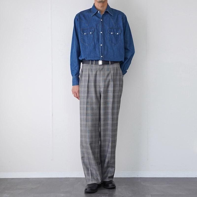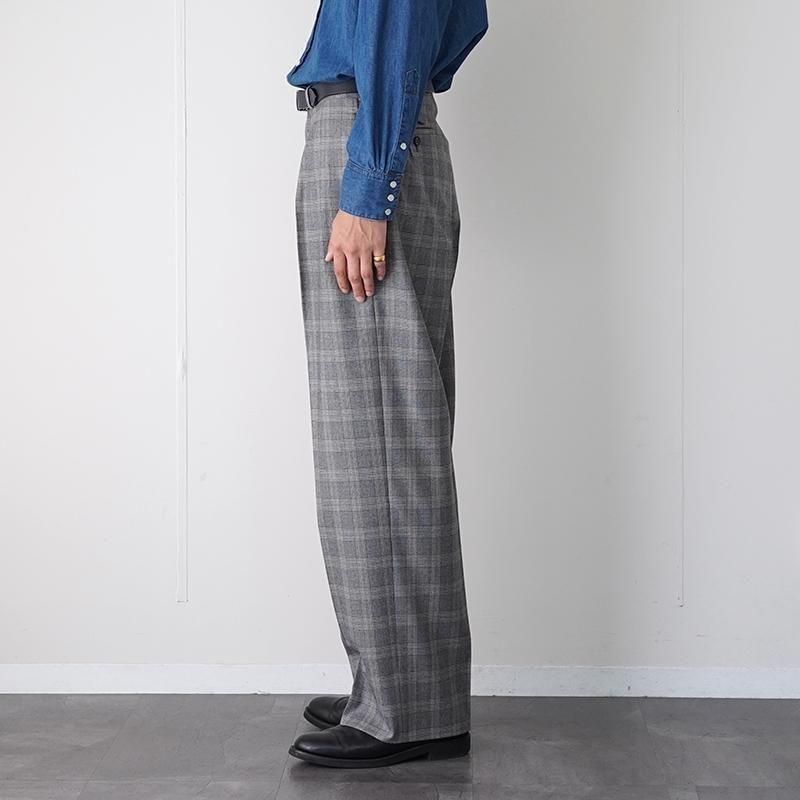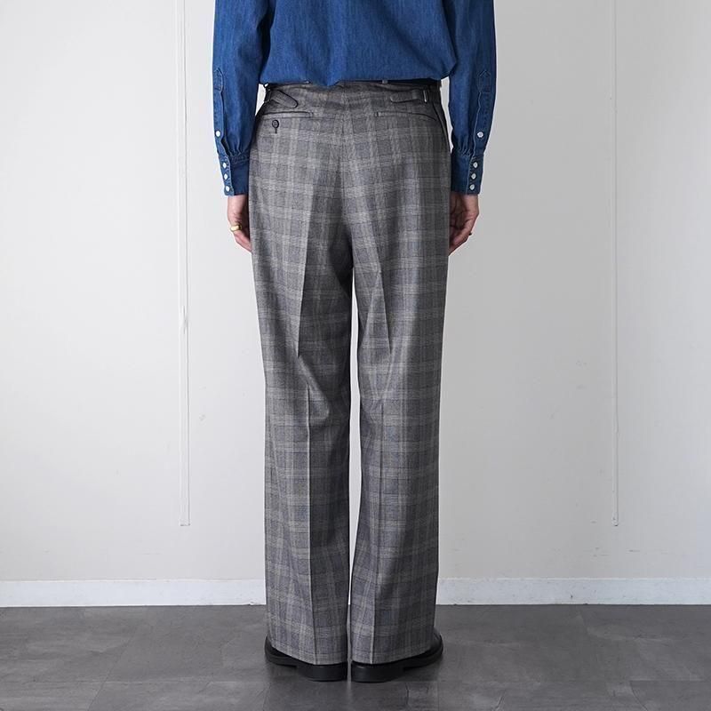 ブランドのアイコンとして毎シーズン高い人気を誇る、“JEFFERLY” トラウザー。 本モデルは、グレーベースのグレンチェックに薄いブラウンが調和した、柔らかな雰囲気の一本。 ヴィンテージ感のあるウール生地は、ハリとコシ、微起毛の高級感ある表情が◎。 動きに合わせて生地が揺れ、秋冬のスタイルにちょうど良い“重さ”を添えてくれます。 ベースとなっているのは、Savile Row(サヴィル・ロウ)のクラシックなテーラードトラウザー型。 やや深めの股上に、2インタック、裾にかけてストンと落ちるセミワイドストレート。 しっかりボリュームを持たせつつ、立ち姿も綺麗なシルエットが、なんとも大人。 シンプルなトップスに合わせても素材の奥行きと色味で空気が変わる。 いつものスタイリングに馴染みつつ、ふとした瞬間に“おやっ?”と思わせる、ちょうどいいアクセント。 ライトな装いに合わせても、しっかり“芯”を感じさせてくれる、頼れる一本です。 モデル身長184cm 体重64kg 着用サイズ3 SIZE(cm) 1:ウエスト81 股上34 股下73 ワタリ34 裾幅25 2:ウエスト84 股上34.5 股下74.5 ワタリ34.5 裾幅26 3:ウエスト86 股上35.5 股下77.5ワタリ35 裾幅26.5 QUALITY WOOL100% LINING:POLYESTER100%