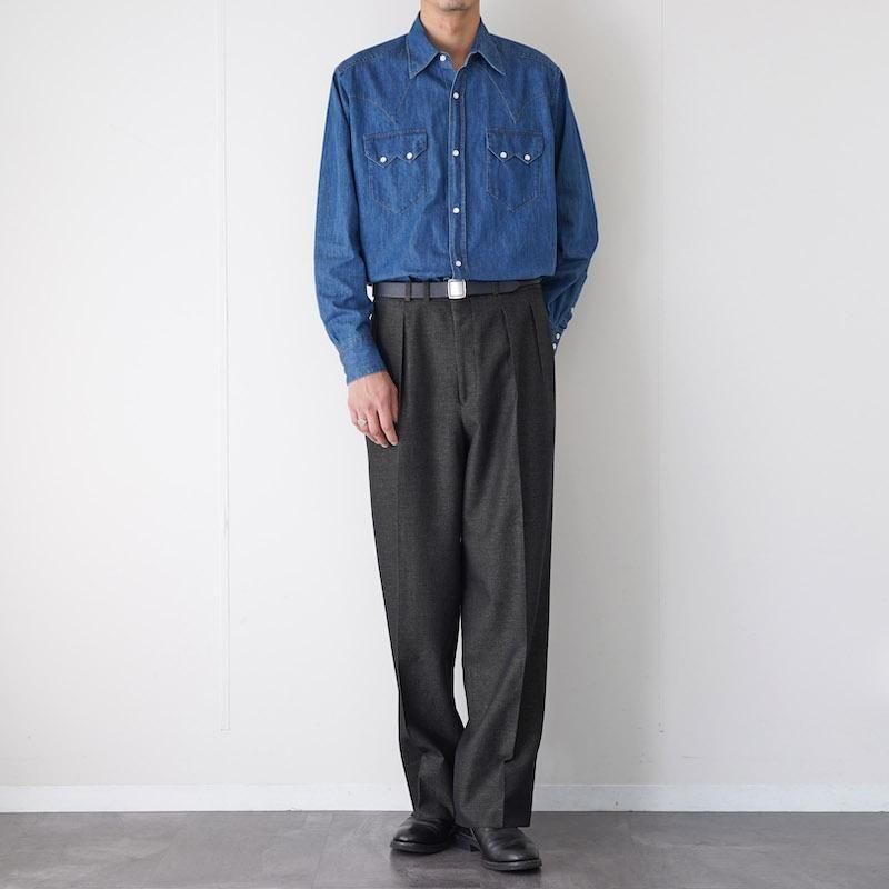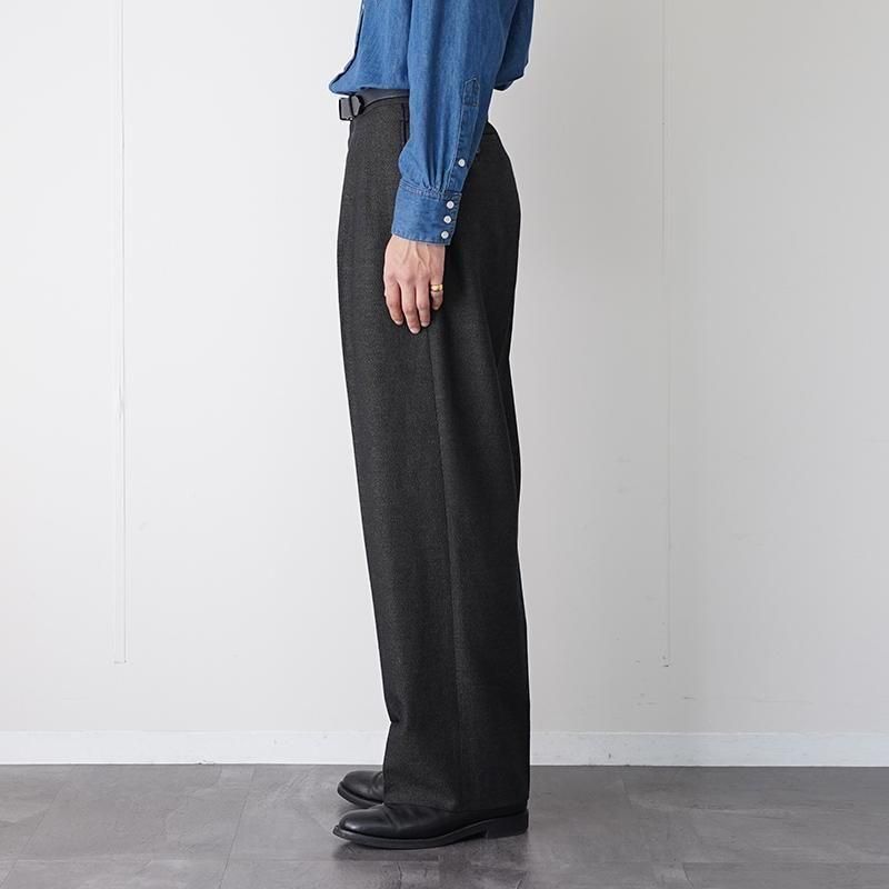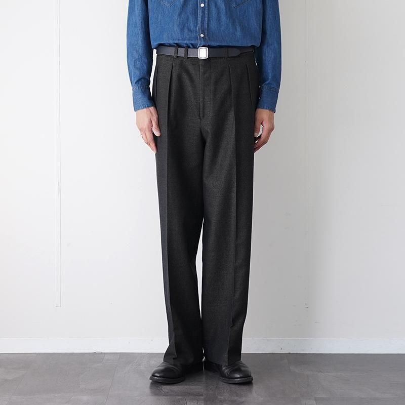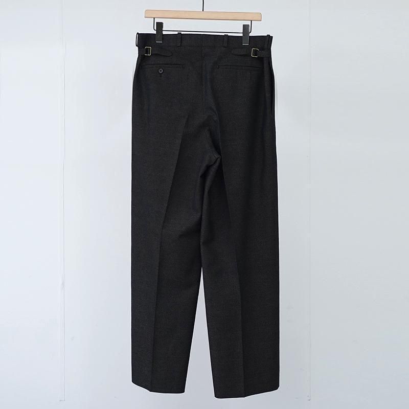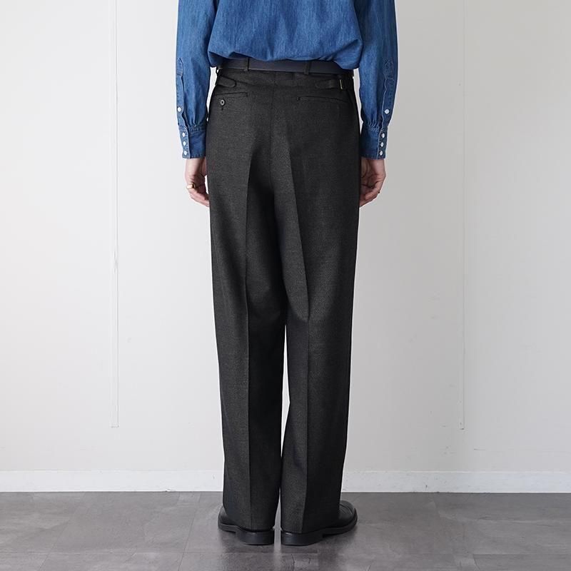 ブランドのアイコンとして毎シーズン高い人気を誇る、“JEFFERLY” トラウザー。 本モデルは、チャコールベースにGREENとORANGEの糸がうっすら見える、独特の色気を持った一本。 ヴィンテージ感のあるウールリネンの生地感は、ハリとコシ、渋さのある表情が◎。 動きに合わせて生地が揺れ、秋冬のスタイルにちょうど良い“重さ”を添えてくれます。 ベースとなっているのは、Savile Row(サヴィル・ロウ)のクラシックなテーラードトラウザー型。 やや深めの股上に、2インタック、裾にかけてストンと落ちるセミワイドストレート。 しっかりボリュームを持たせつつ、立ち姿も綺麗なシルエットが、なんとも大人。 シンプルなトップスに合わせても素材の奥行きと色味で空気が変わる。 いつものスタイリングに馴染みつつ、ふとした瞬間に“おやっ?”と思わせる、ちょうどいい違和感。 ライトな装いに合わせても、しっかり“芯”を感じさせてくれる、頼れる一本です。 モデル身長184cm 体重64kg 着用サイズ3 SIZE(cm) 1:ウエスト81 股上34 股下73 ワタリ34 裾幅25 2:ウエスト84 股上34.5 股下74.5 ワタリ34.5 裾幅26 3:ウエスト86 股上35.5 股下77.5ワタリ35 裾幅26.5 QUALITY WOOL84% LINEN16% LINING:POLYESTER100%