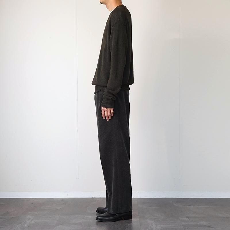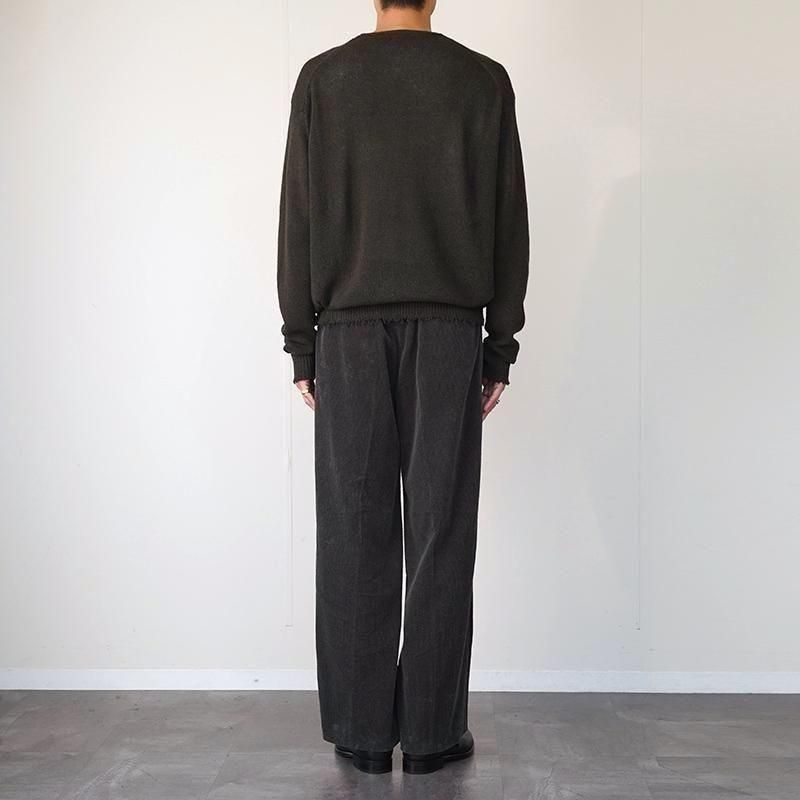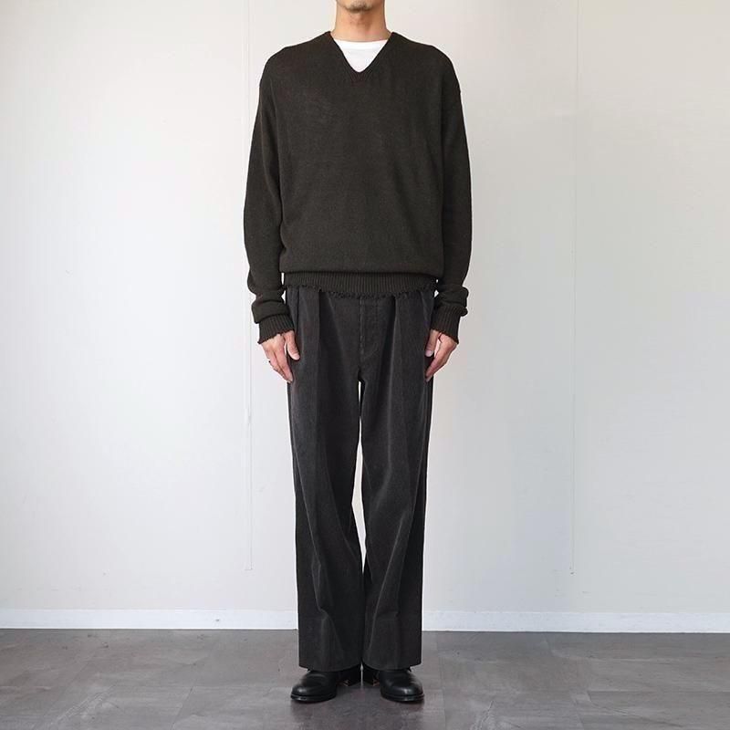 カシミヤを主役に、セーブルとミンクをブレンドした特別配合。 ドライなタッチながらも滑らかさと奥行きのある表情。触れた瞬間に違いがわかる上質なニットです。 甘く編まれたルーズフィットのVネックは、空気を含むように身体を包み込み、軽やかでリラックスした着心地。 裾と袖口は“目を飛ばした”ラフな仕上げで、品の中に自然体のニュアンスを添えています。 気負わずに着られるのに、どこか上品。 そんなMAATEE&SONSらしい空気を纏った一枚です。 【スタッフコメント】 去年買えなかったカシミヤミンクニットのアップデート版。 素材好きの僕は買えずに悔しい思いをしたので、今季は個人オーダー。 今年は同じくイタチ科の、セーブル(クロテンともいう)がブレンドされてます。 たまらない着心地なのはもちろんですが、色味とディテールが良いですよね。 極上の肌触りは継続しつつ、色味は去年と打って変わって無骨な色味。 無骨に見えるニットはチクチクしがちですが、こちらは至高の滑らかさですよ。 袖口と裾口には、あえて“ほつれ”のように見えるデザインが。 まるでイタチに噛まれたようなディテールも遊び心があってお気に入りです。 モデル身長184cm 体重64kg 着用サイズ3 SIZE(cm) 2:着丈64 肩幅54 身幅60 袖丈63 3:着丈66 肩幅55 身幅61 袖丈65 QUALITY CASHEMERE76% SABLE15% MINK9%