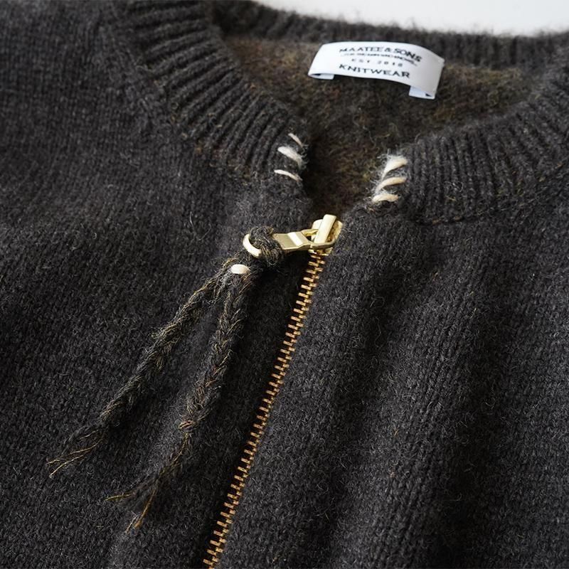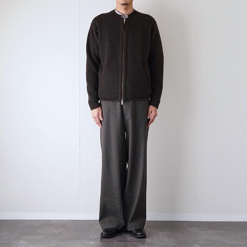 表側にはカシミヤ100%、裏側にはウール100%を配した二重構造の編み地は、ひょっとこ編みの特徴である“表と裏の質感差”をはっきり感じられる構成。 肌に触れる内側は柔らかく、外側はカシミヤ特有の起毛感が心地よい、シリーズらしい贅沢なつくりになっています。 ネックに走るステッチワークやファスナーのミサンガ、裏表をひっくり返して表現したエルボーパッチなど今季のモデルならではの要素も盛り込まれています。 袖口や裾が返り、わずかに裏糸がのぞく仕様もこなれ感があって良い。 編み地の“表情”に自然な変化をつくり出し、シンプルなシルエットながら印象に残る佇まいに仕上げています。 モデル身長184cm 体重64kg 着用サイズ3 SIZE(cm) 1:着丈64 肩幅45 身幅57 袖丈57 2:着丈65 肩幅47 身幅59 袖丈59 3:着丈66 肩幅48 身幅60 袖丈60 QUALITY 表面:CASHEMERE100% 裏面:WOOL100%